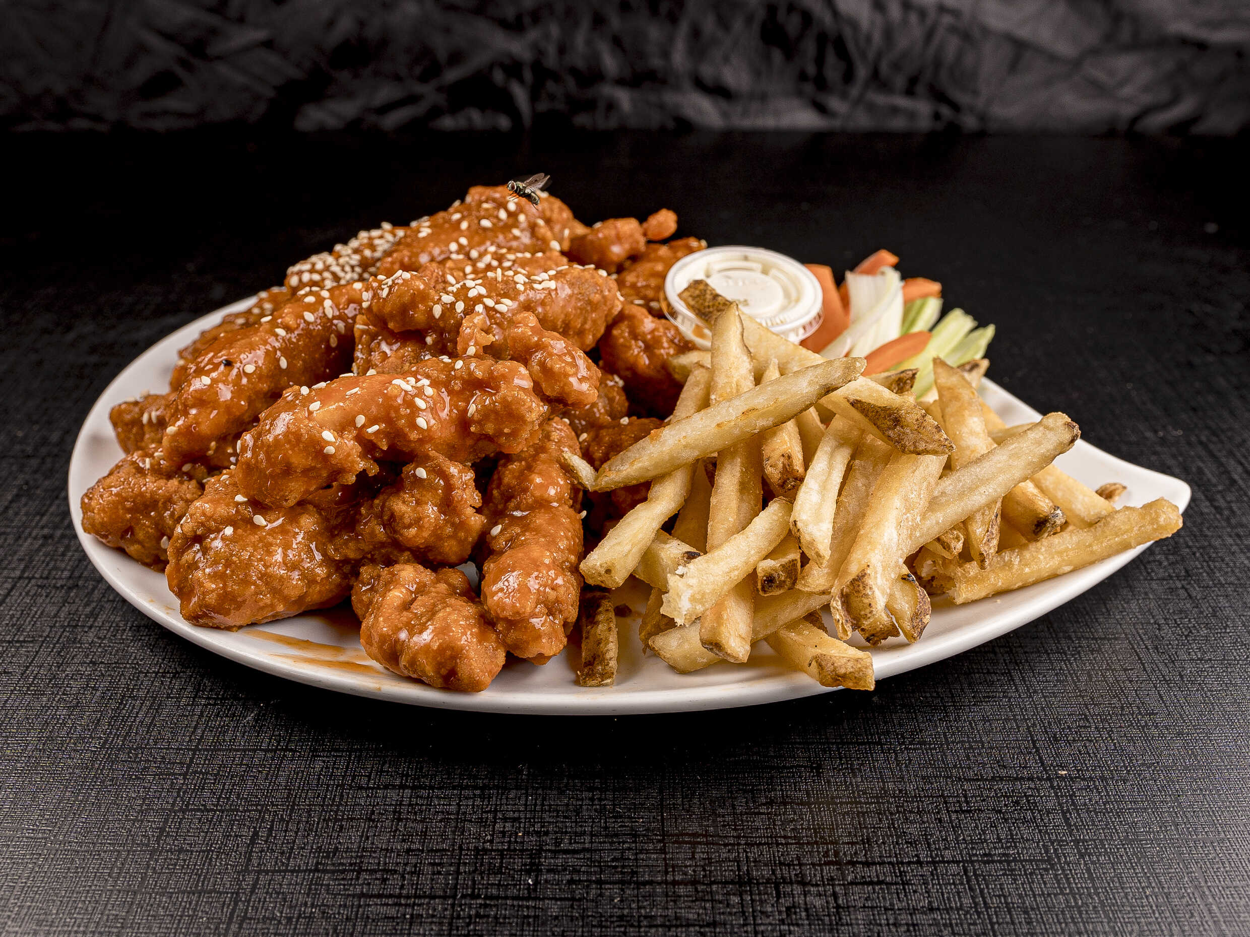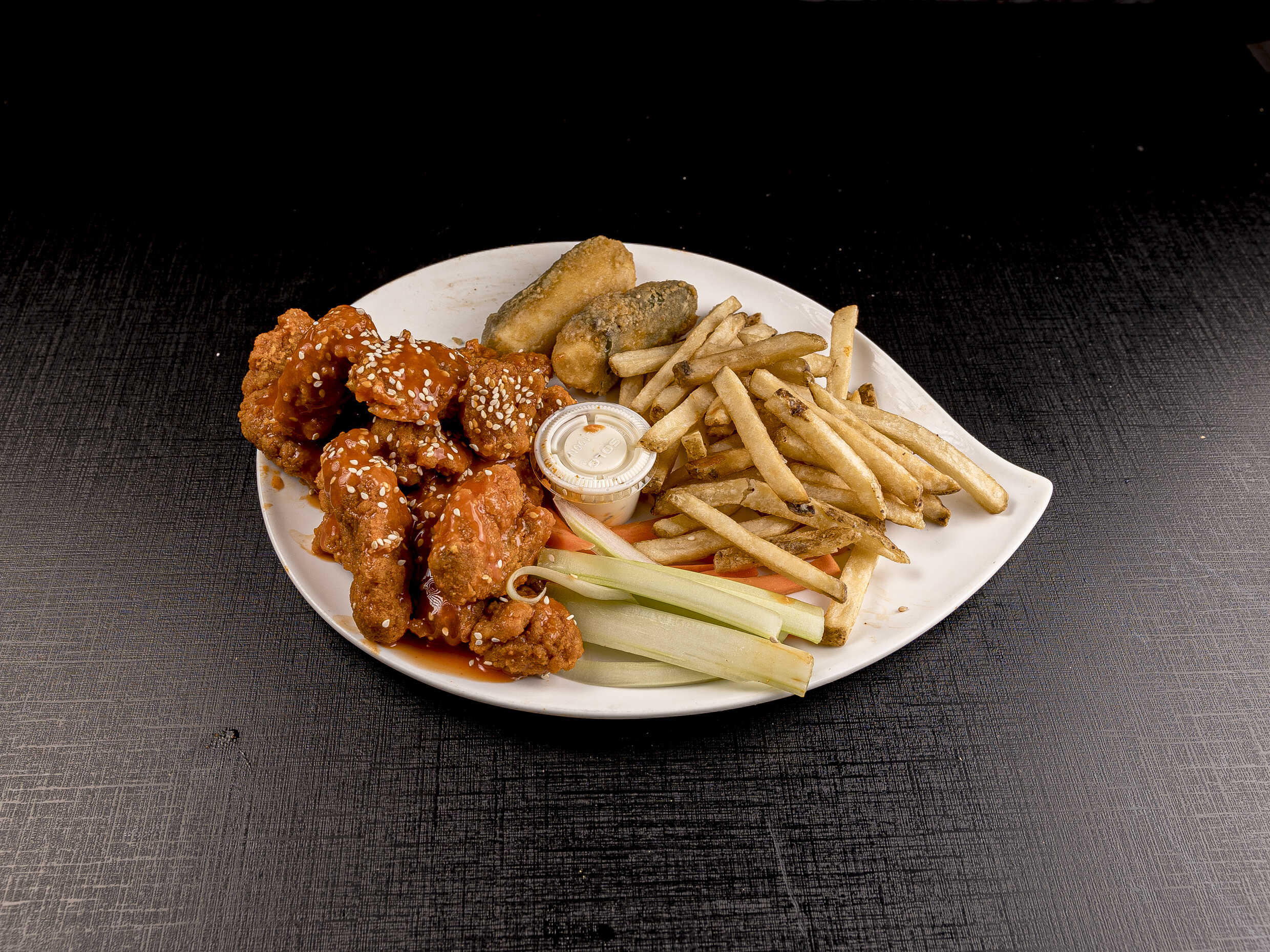 250 grms de Boneless , bañados en la salsa de tu eleccion, acompañado de verdura y aderezo ranch