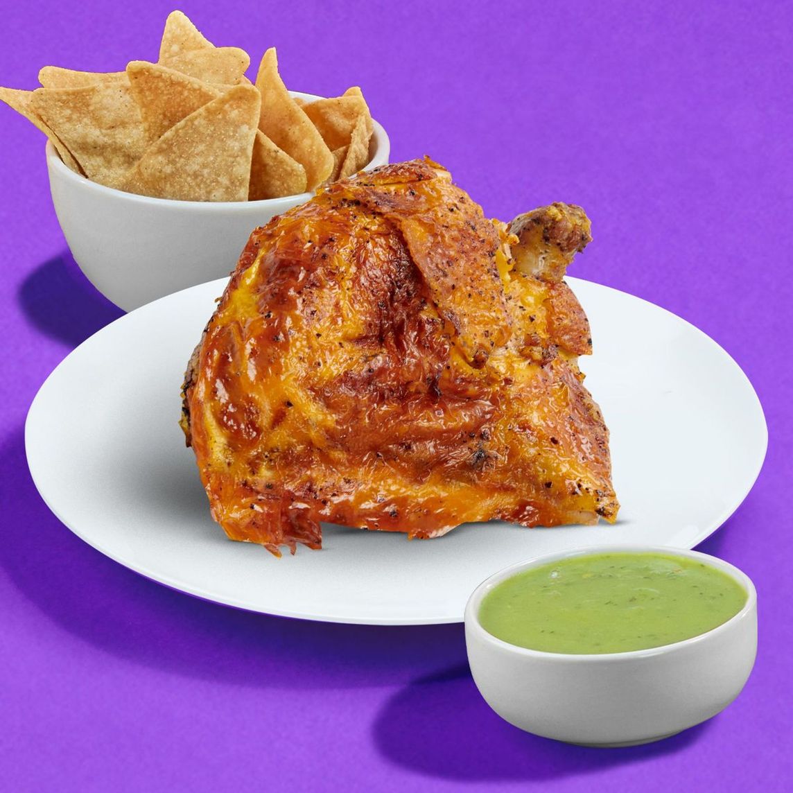 Pollo 2 piezas, 2 complementos y refresco a elección. Incluye salsas, tortillas y totopos.