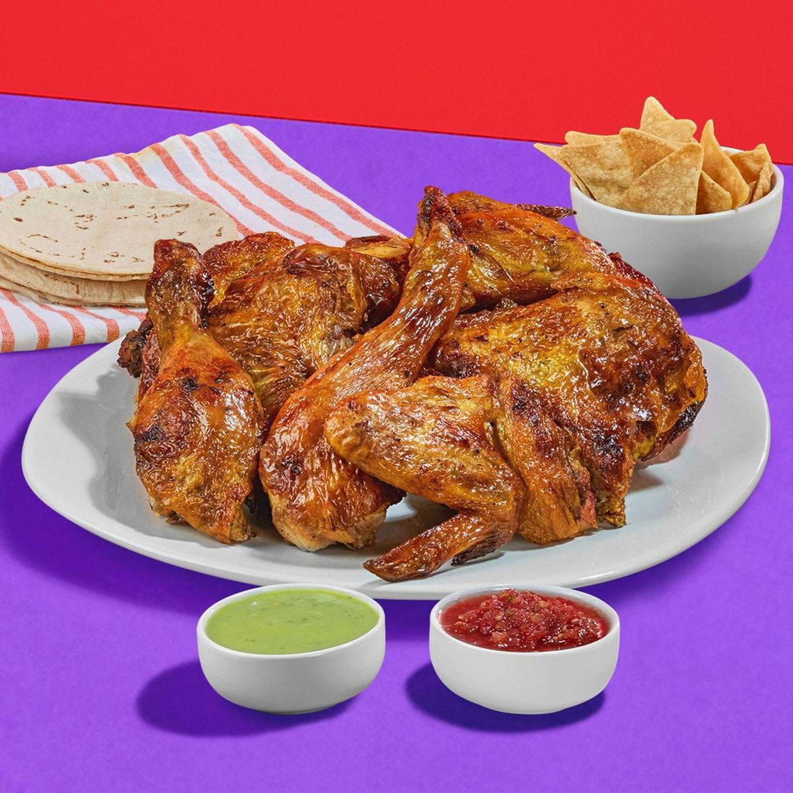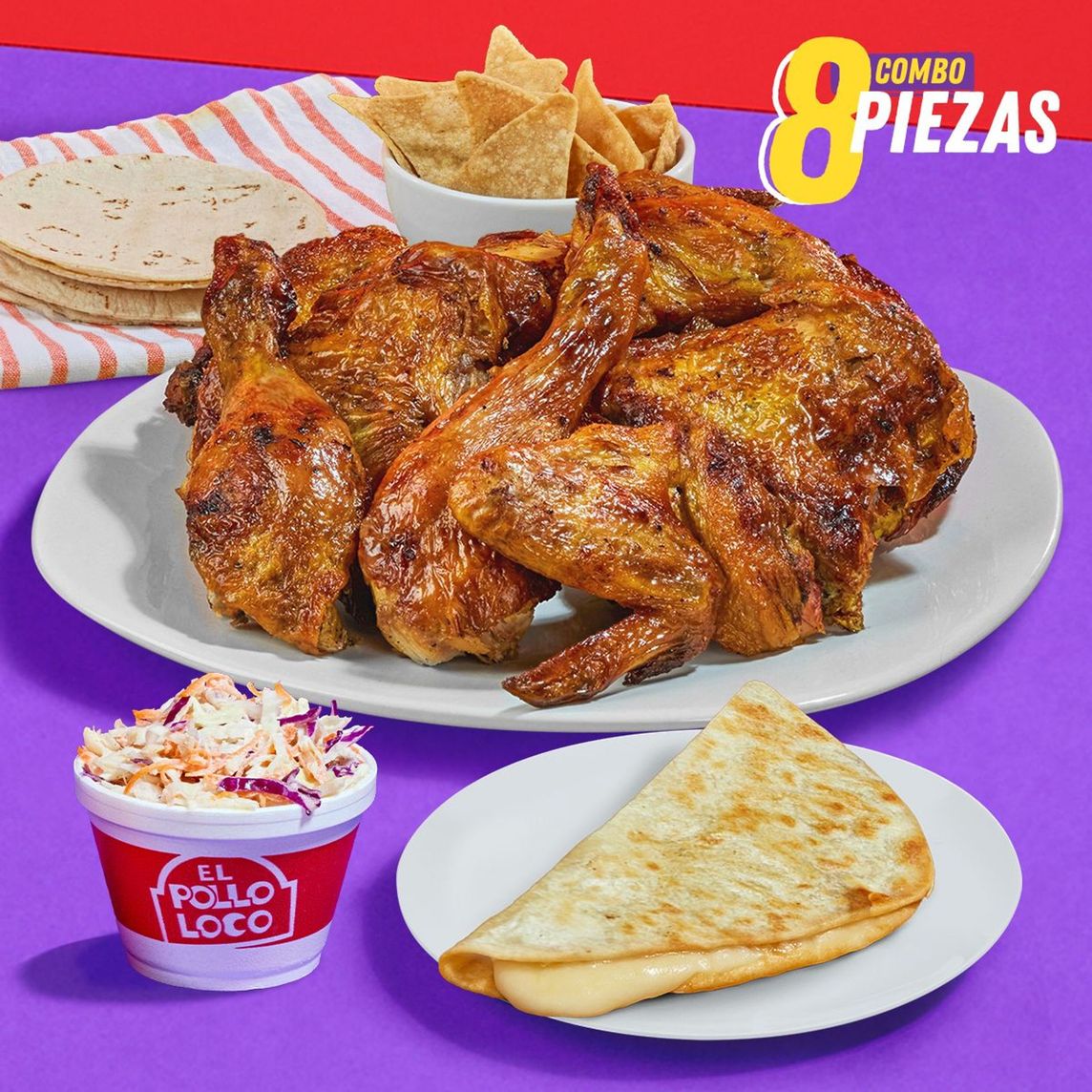 Pollo 8 piezas: 2 alas, 2 muslos, 2 pechuga, 2 piernas y 2 complementos a elección. Incluye salsas, tortillas y totopos.