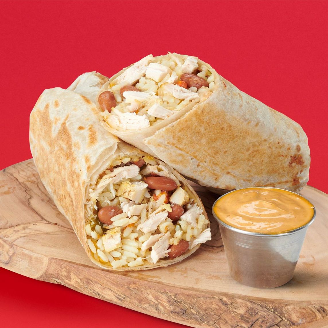 Burrito con pollo loco, frijol y arroz en tortilla de harina grande 28 cm, incluye 1 salsa verde y 1 salsa roja