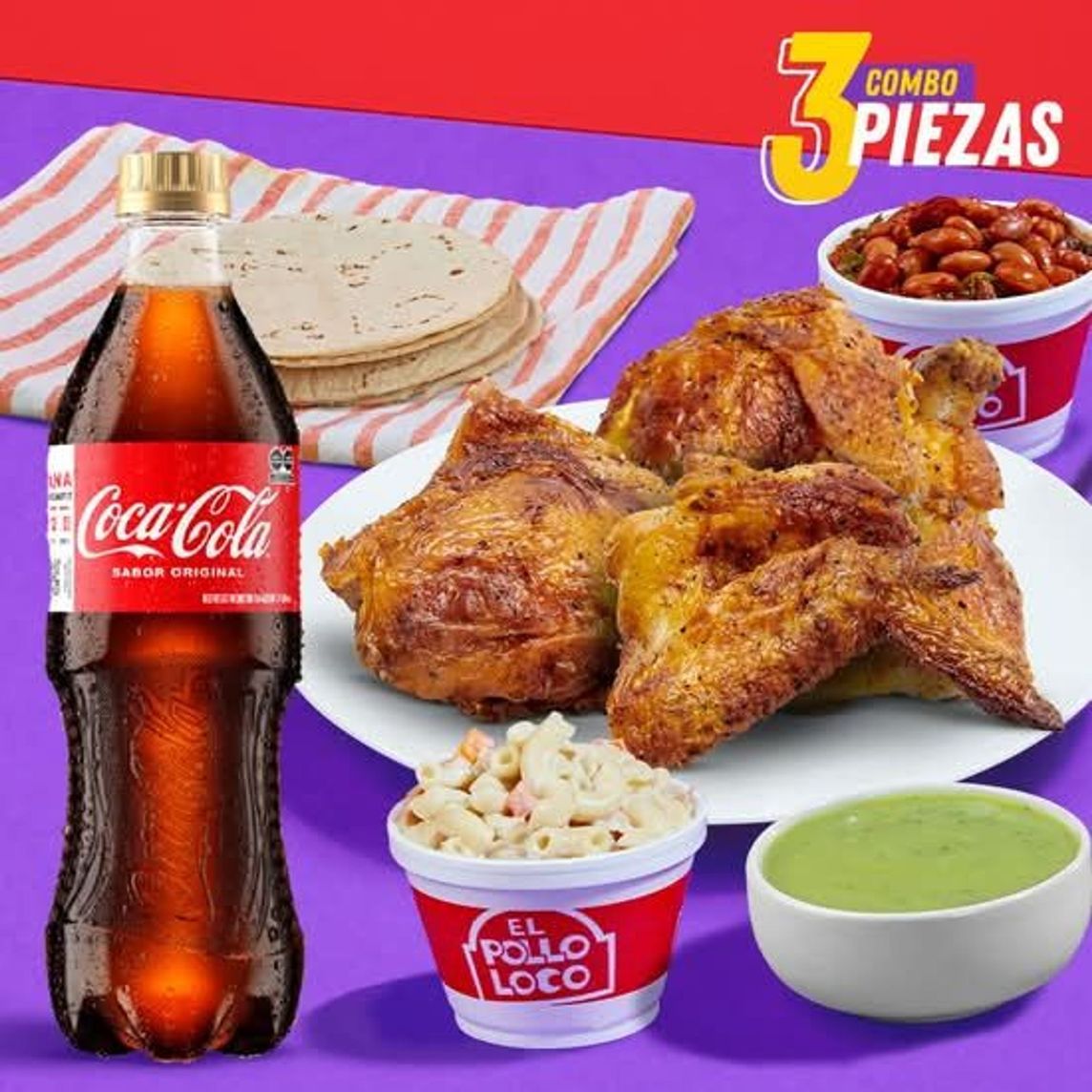 Pollo 3 piezas y 2 complementos a elección. Incluye salsas, tortillas y totopos.