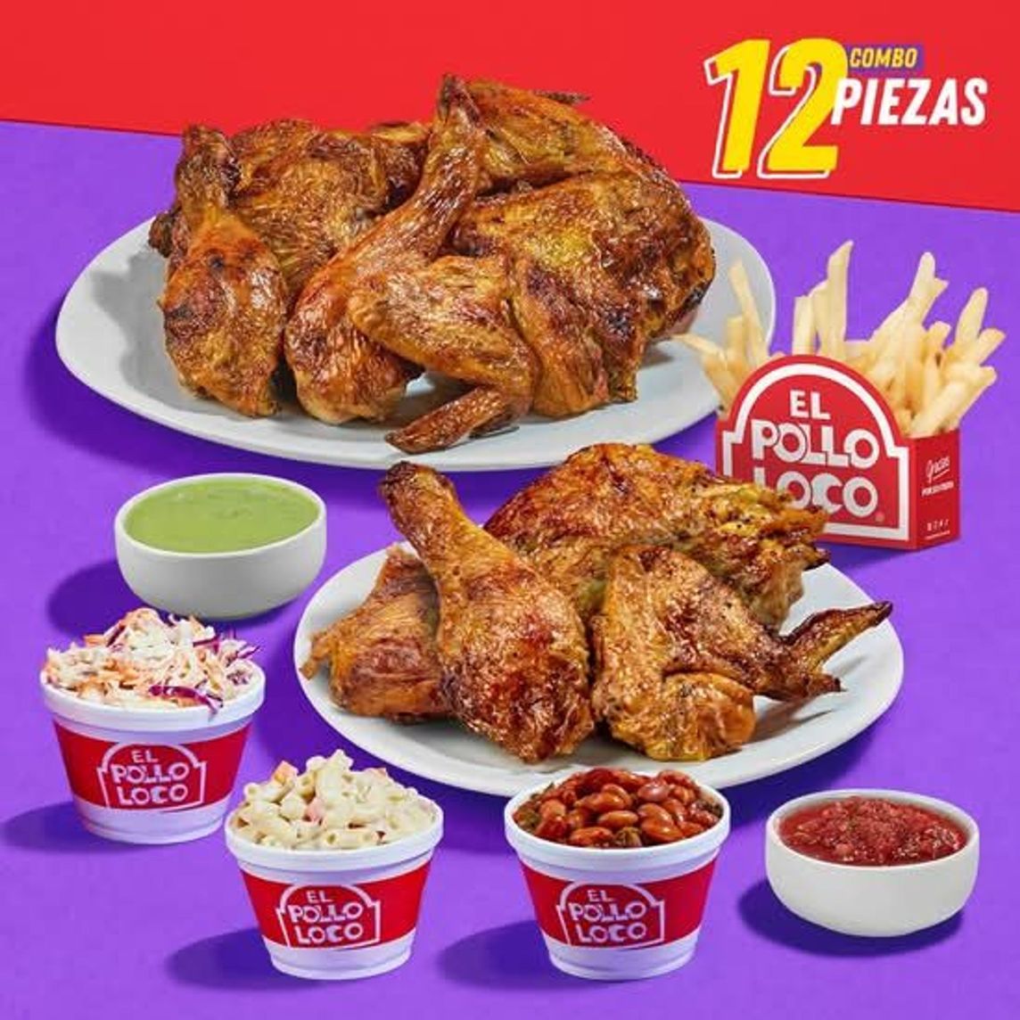 Pollo 12 piezas: 3 alas, 3 muslos, 3 pechuga, 3 piernas y 4 complementos a elección. Incluye salsas, tortillas y totopos.