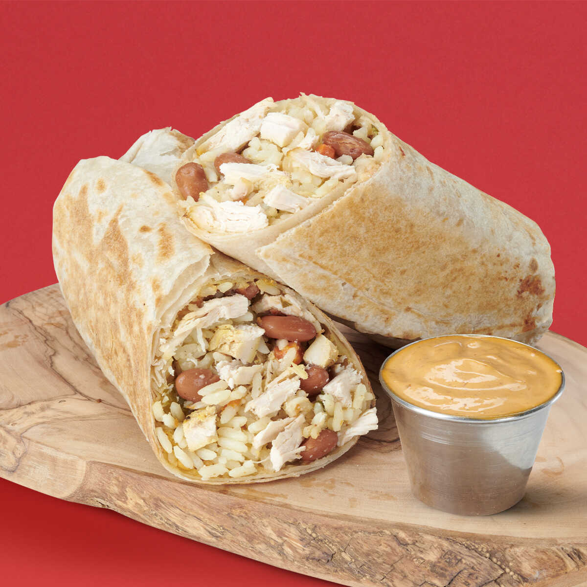 Burrito con pollo loco, frijol y arroz en tortilla de harina grande 28 cm, incluye 1 salsa verde, 1 salsa roja .