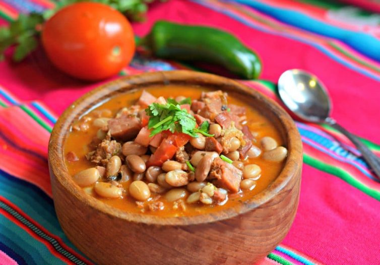 1/2 litro de frijoles charros, totopos, cebolla asada, salsa, tortillas , y salchicha