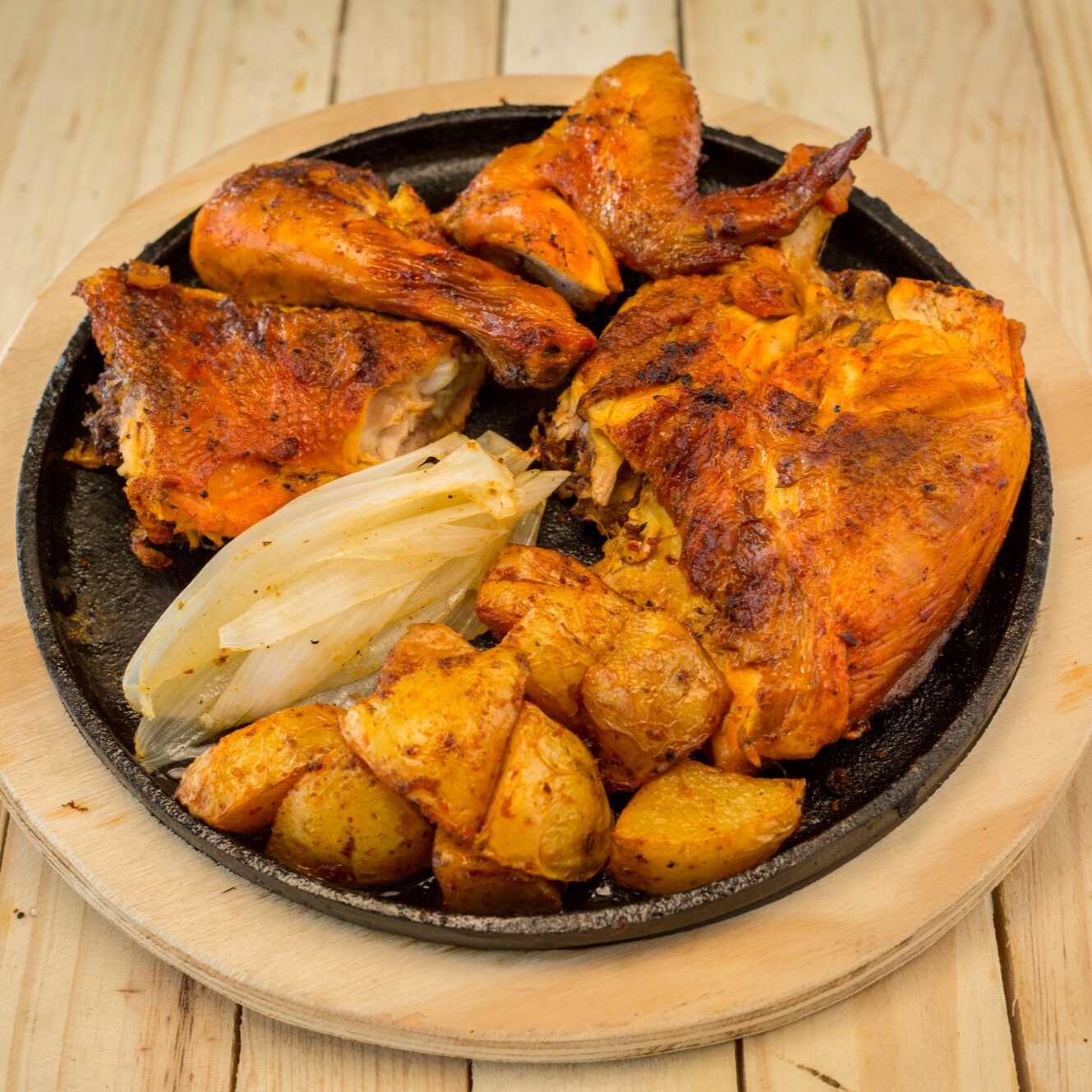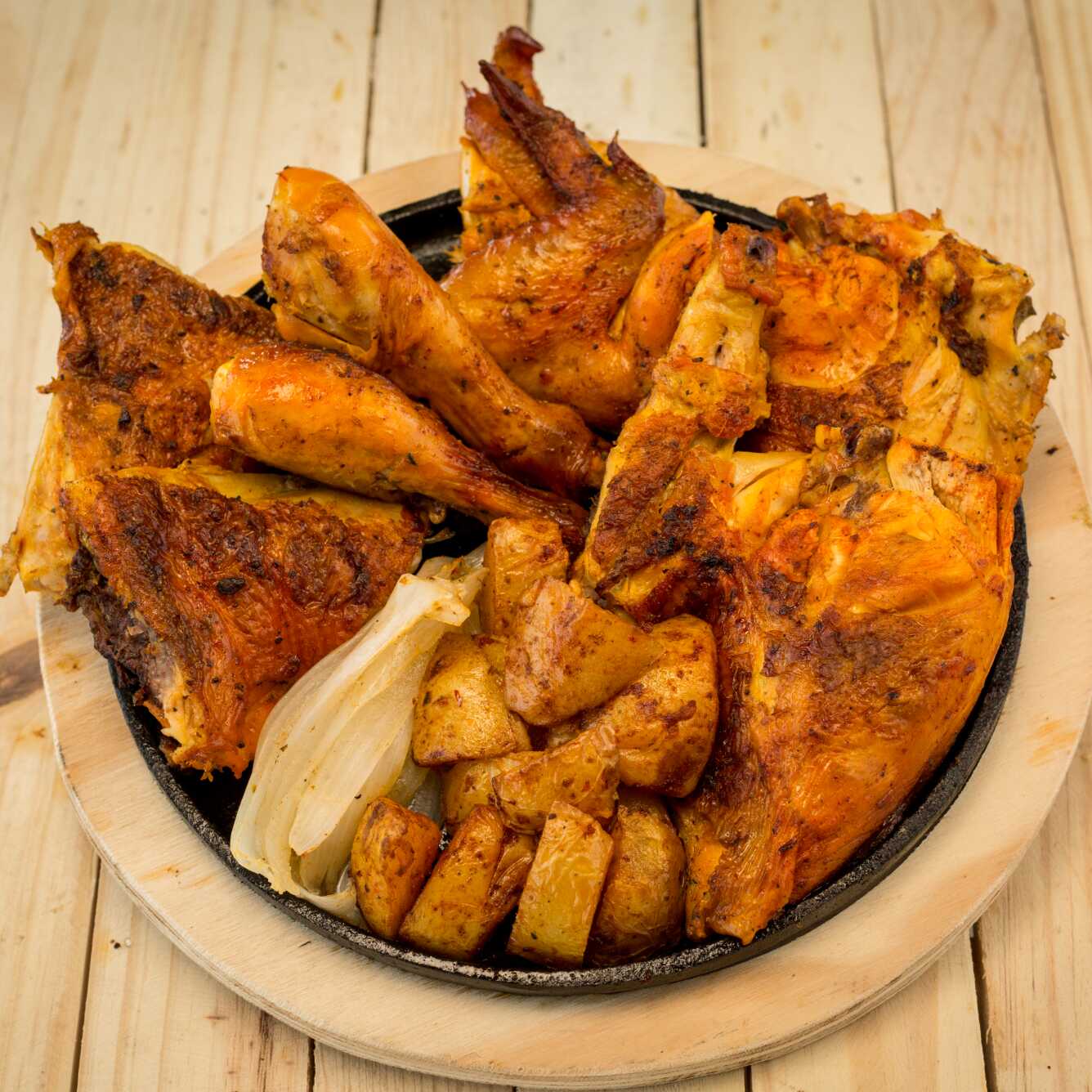 2 jugosos pollos a la parrilla c/papa, cebolla/salsa y totopos