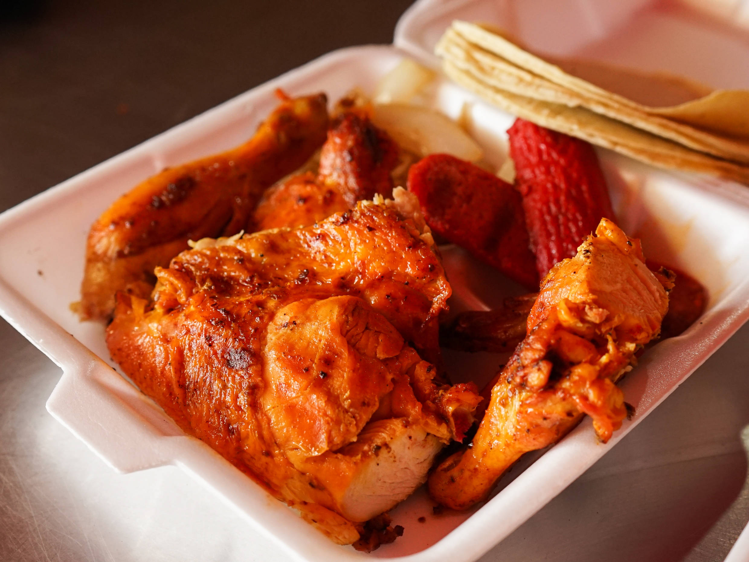 1 pollo más medio kg de arrachera más complementos (cebolla,salsa, tortillas,totopos)