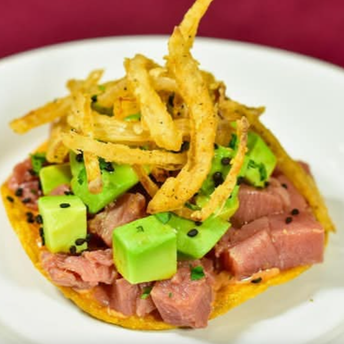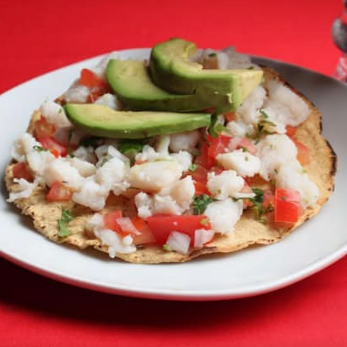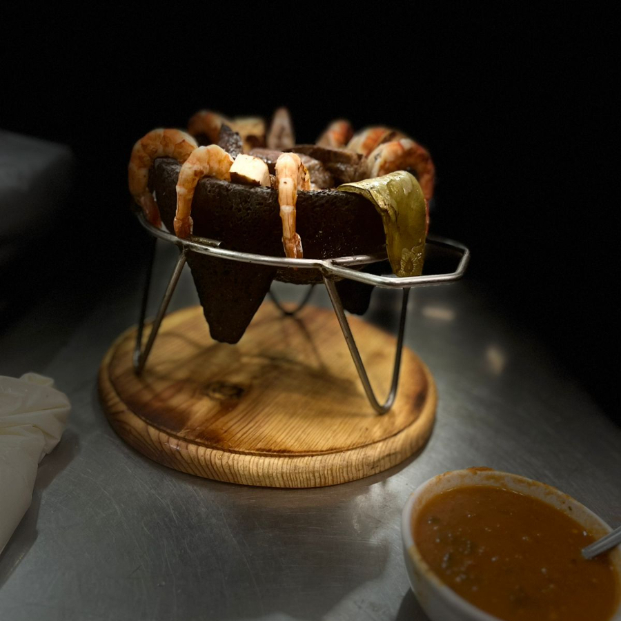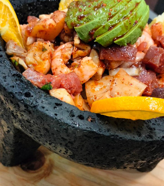 Camarón, camarón curtido, pulpo, atún, salsa negra, aguacate.