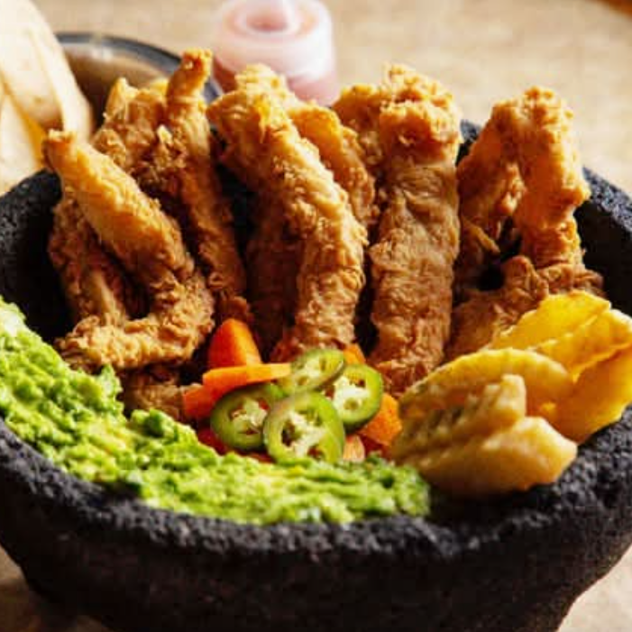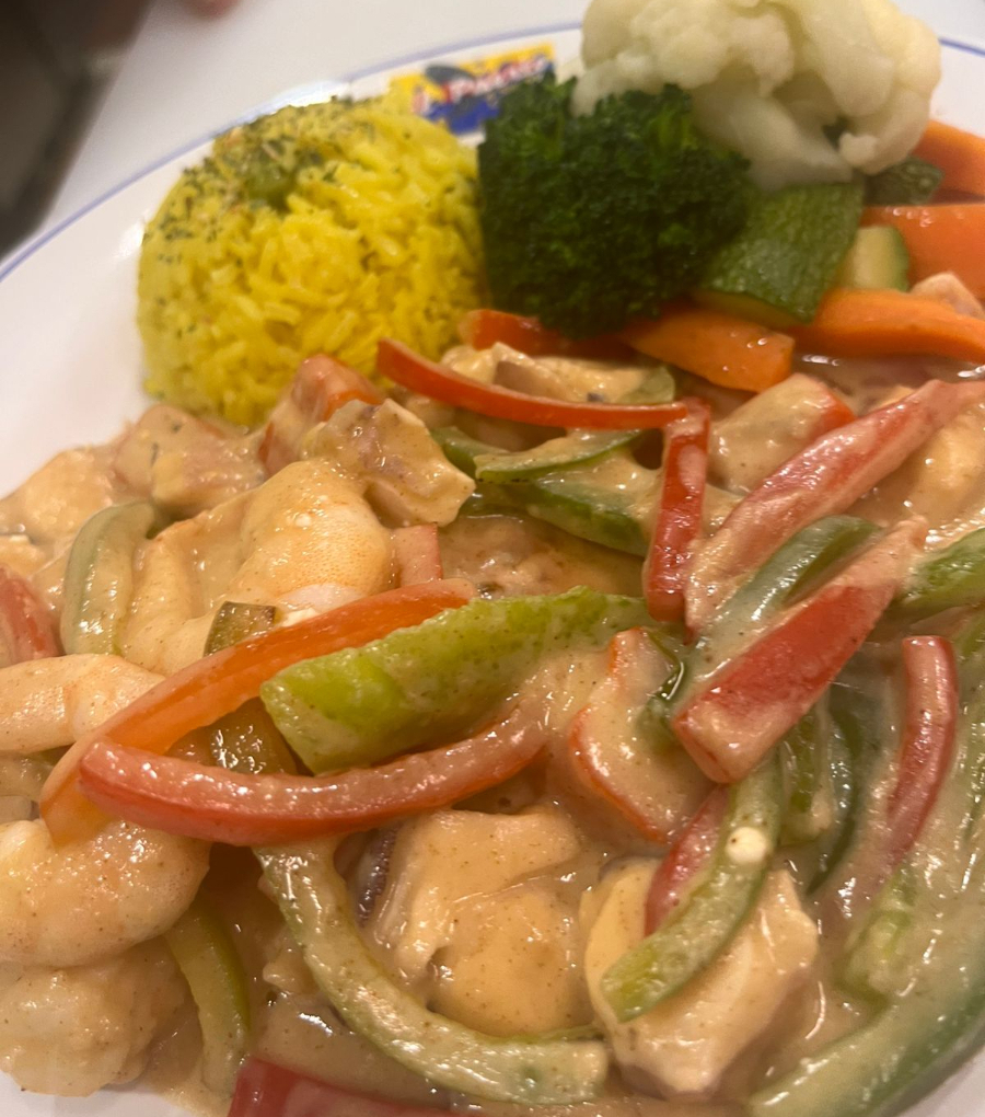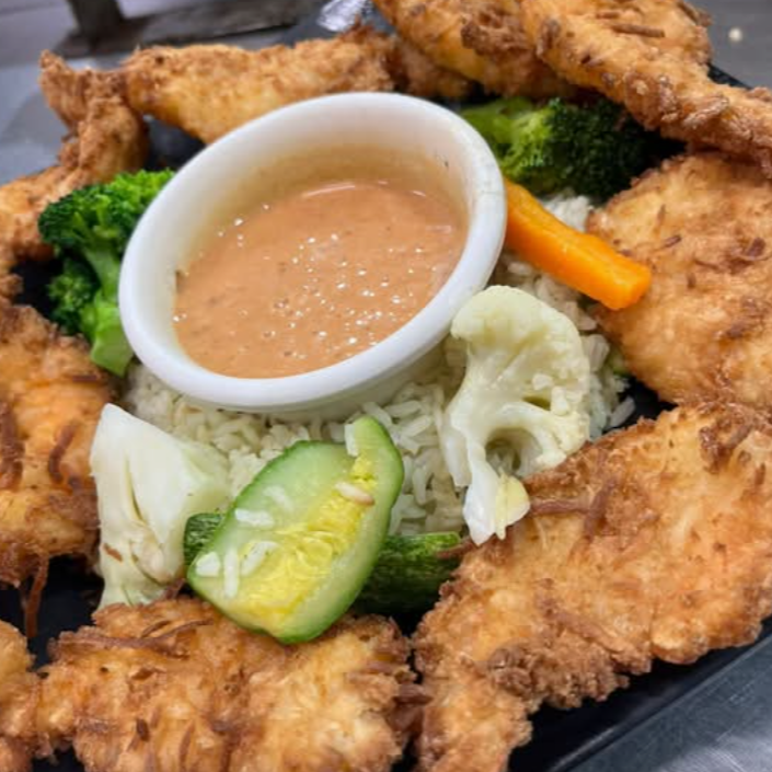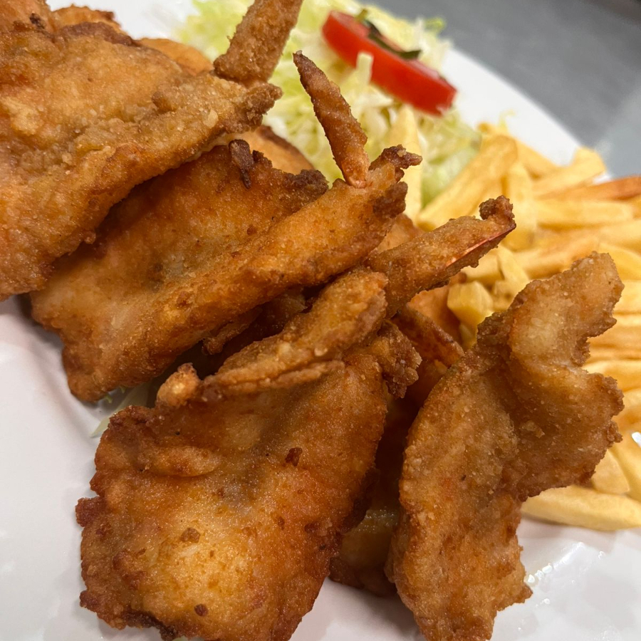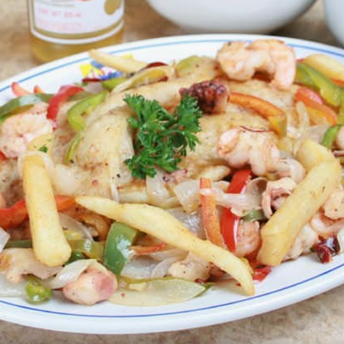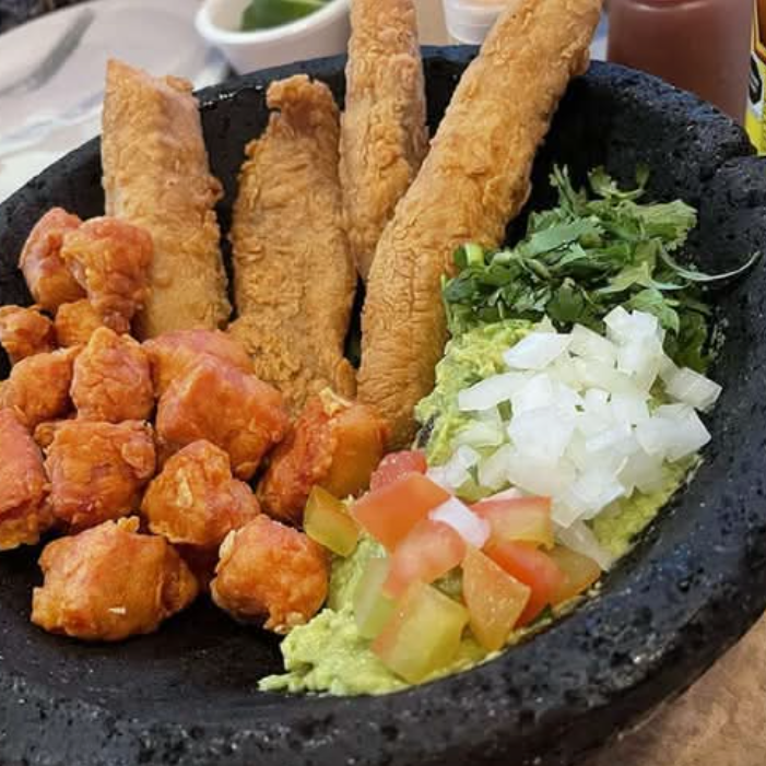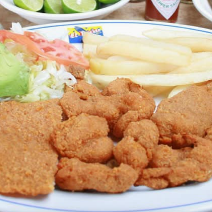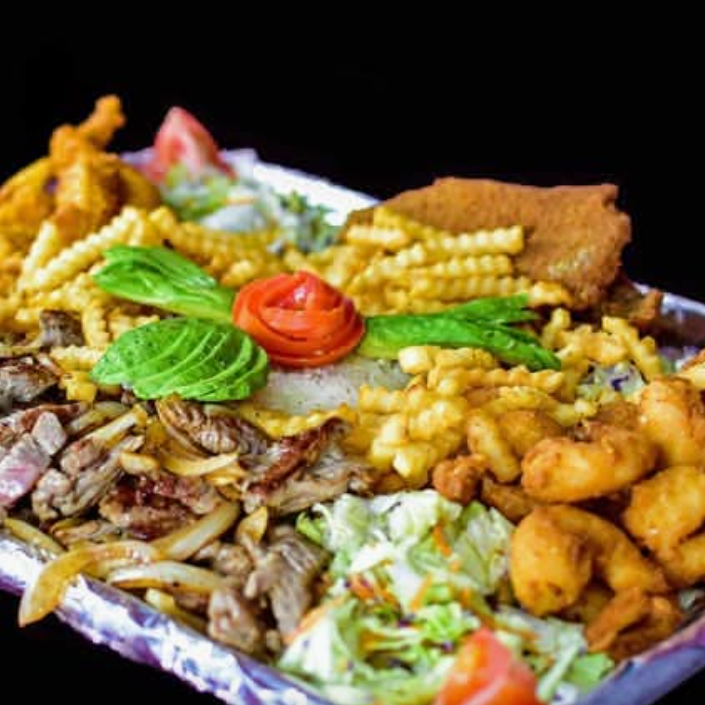 1/2 kg De fajitas de res, chicken tender, camarones y filete empanizados, aros de cebolla, ensalada verde, papas a la francesa y arroz blanco.