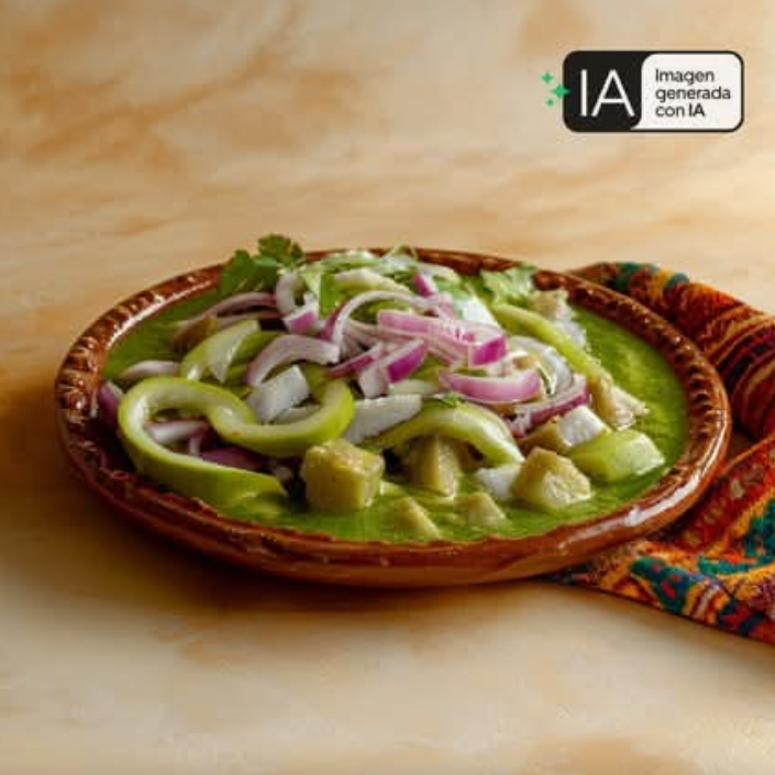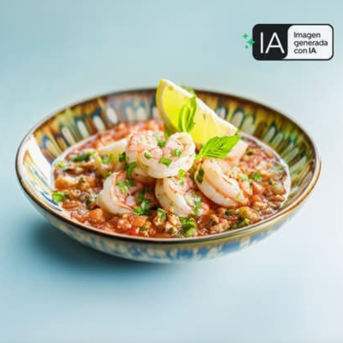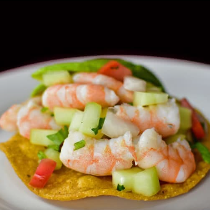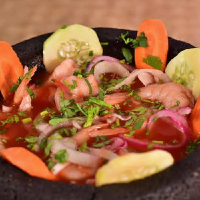 Camarones curtidos en salsa de chile serrano, limón y pepino.
