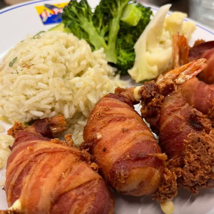 Filete a la plancha, gratinado con camarón, champiñones, pimientos y tocinos.