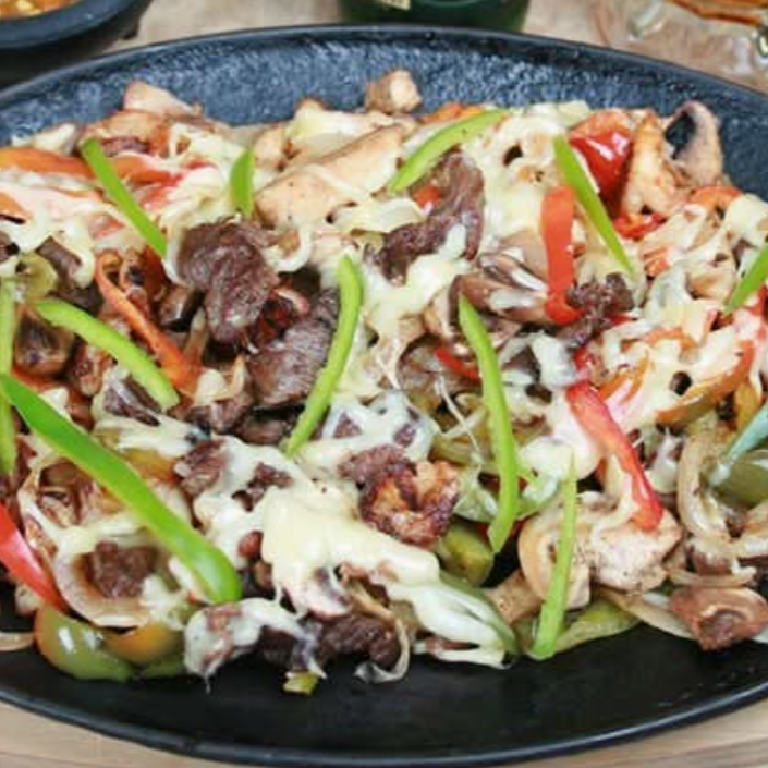 Fajita de pollo, fajita de res, camarones y gratinado con champiñones y chile morrón.