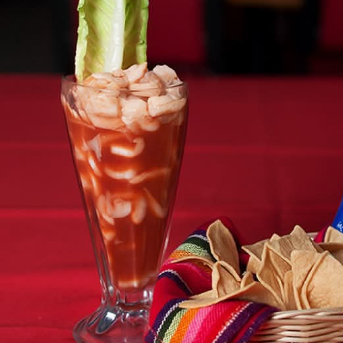 Camarones curtidos en salsa de clamato y chile de árbol.