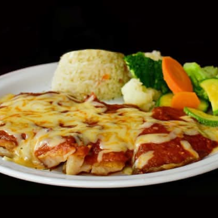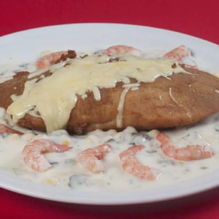 Filete, relleno de jamón y queso amarillo, gratinado, empanizado y con crema bechamel.