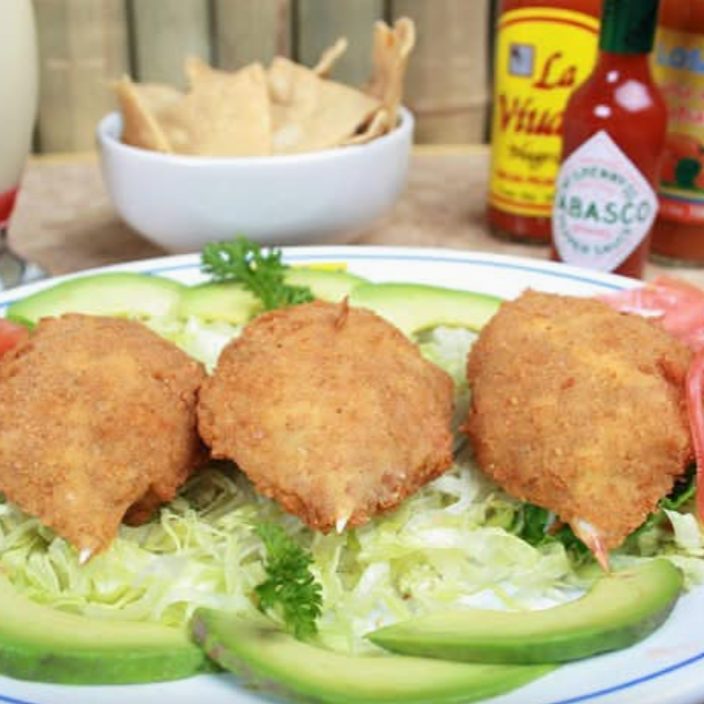 Concha de jaiba, relleno de pulpa de jaiba, empanizadas.