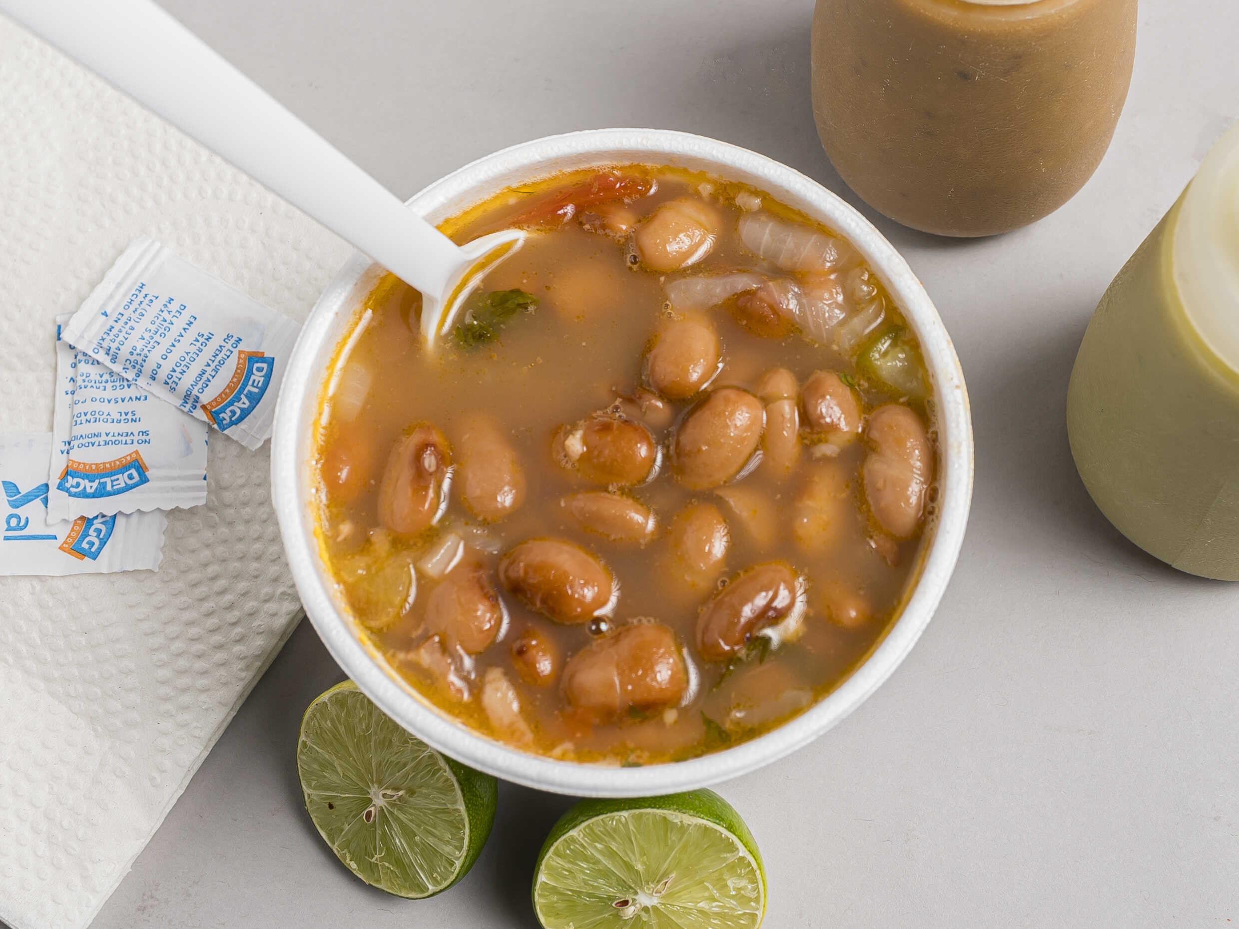 Frijoles con cueritos de puerco, chile, tomate, cebolla y tocino. Acompañados con limón.
