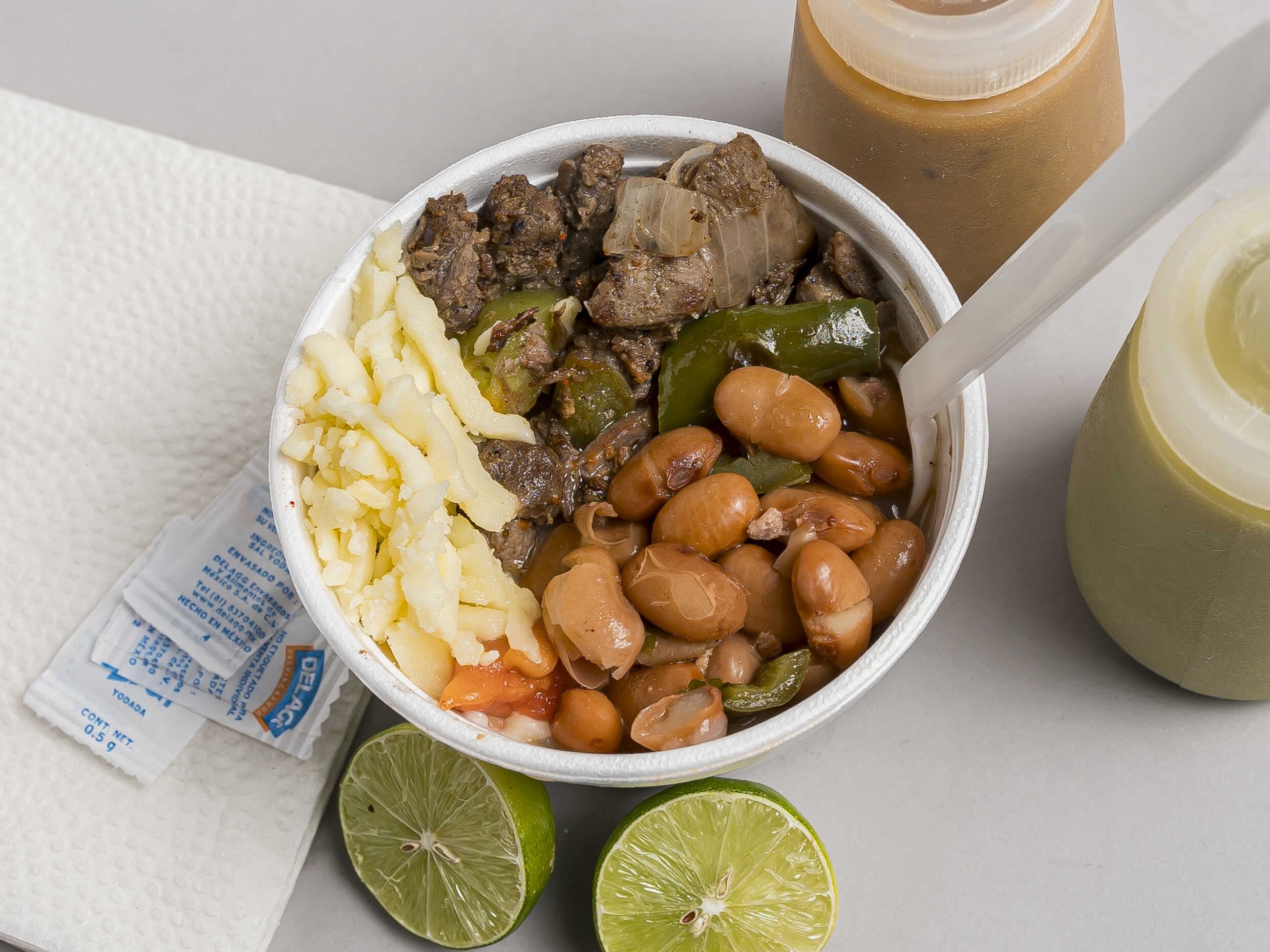 Frijoles con cueritos de puerco, chile, tomate, cebolla y tocino, con carne de trompo o arrachera.
