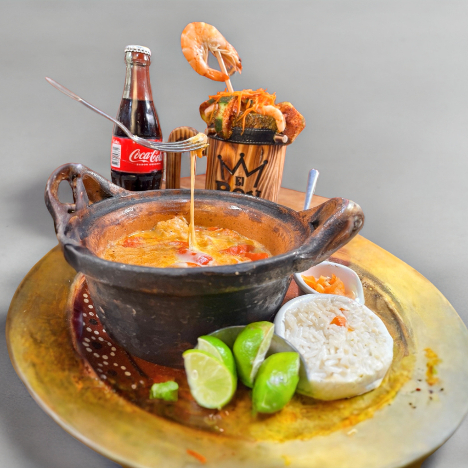 Caldo de pescado camaron filete pulpo pimientos mixtos queso gratinado, salsa zarandeada y diabla acompañado de arroz pieza de pan y chile habanero picadito