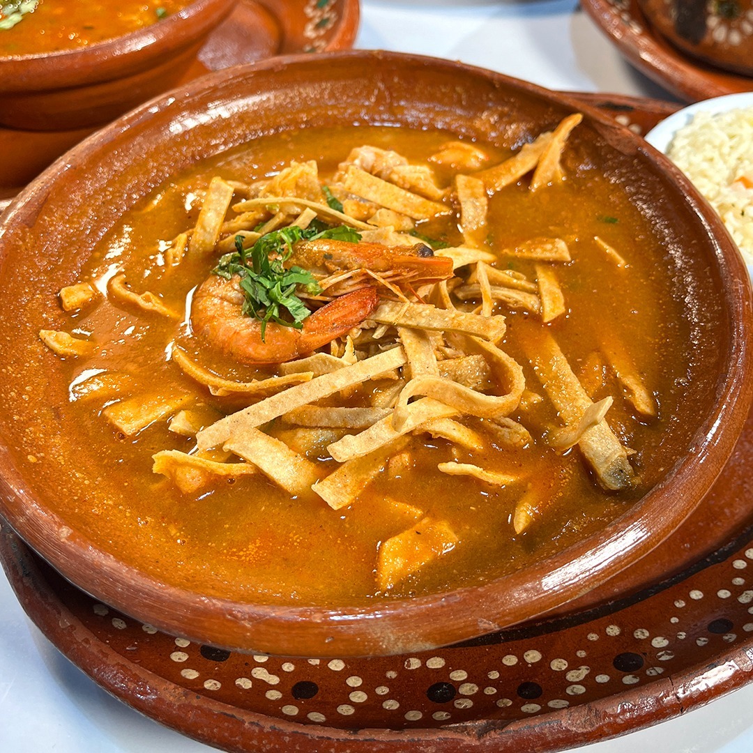 Caldo de la casa especial filete y camaron con tiras de tortillas fritas, lamina de queso y aguacate