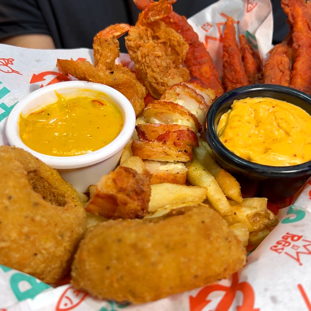 Filete y camarones empanizados, aros de cebolla, dedos de queso, papas fritas, arroz, ensalada del dia y consome personal