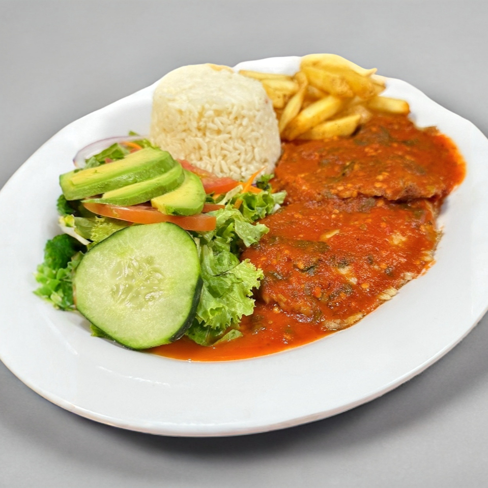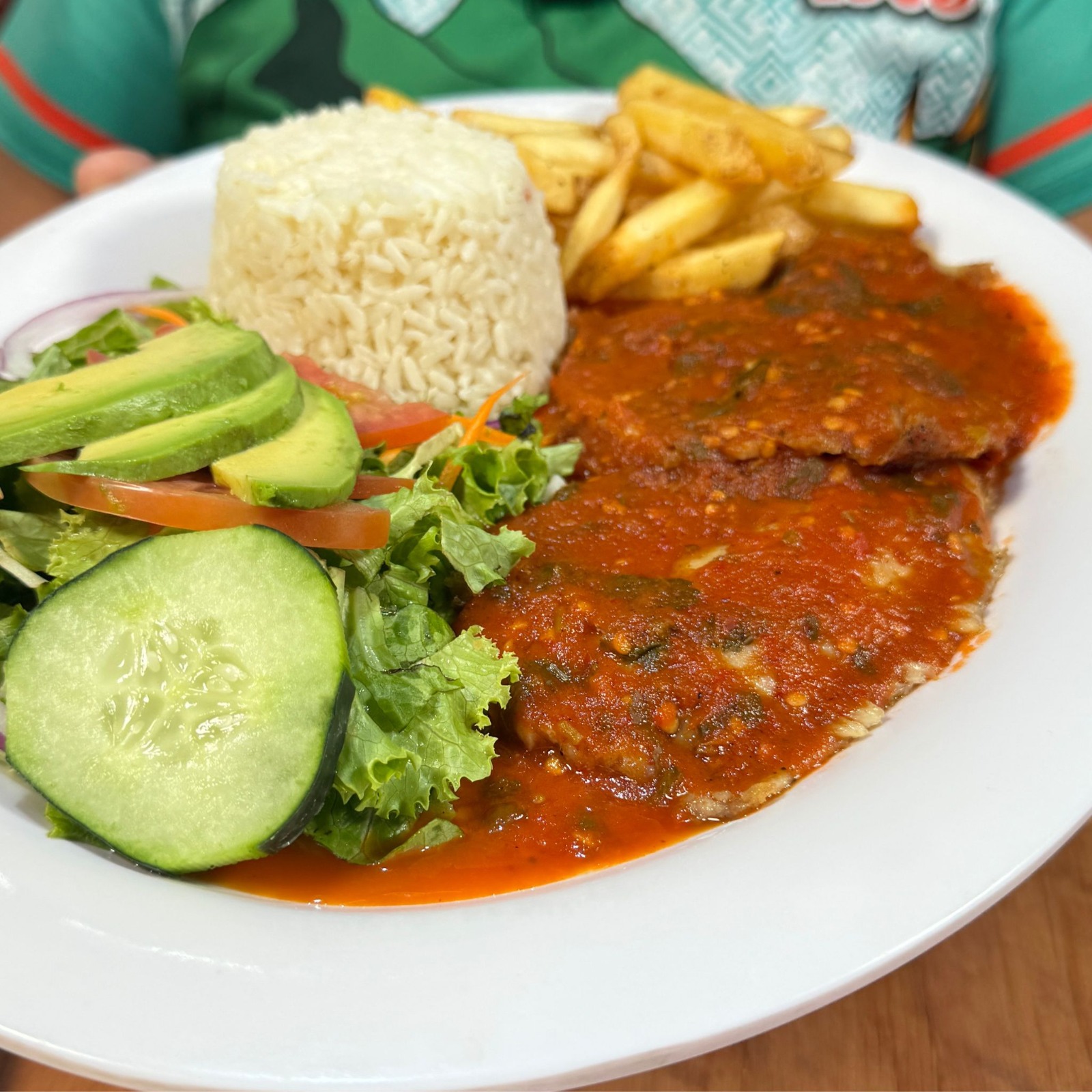 Filete bañado en salsa mexicana acompañado de papas arroz y ensalada