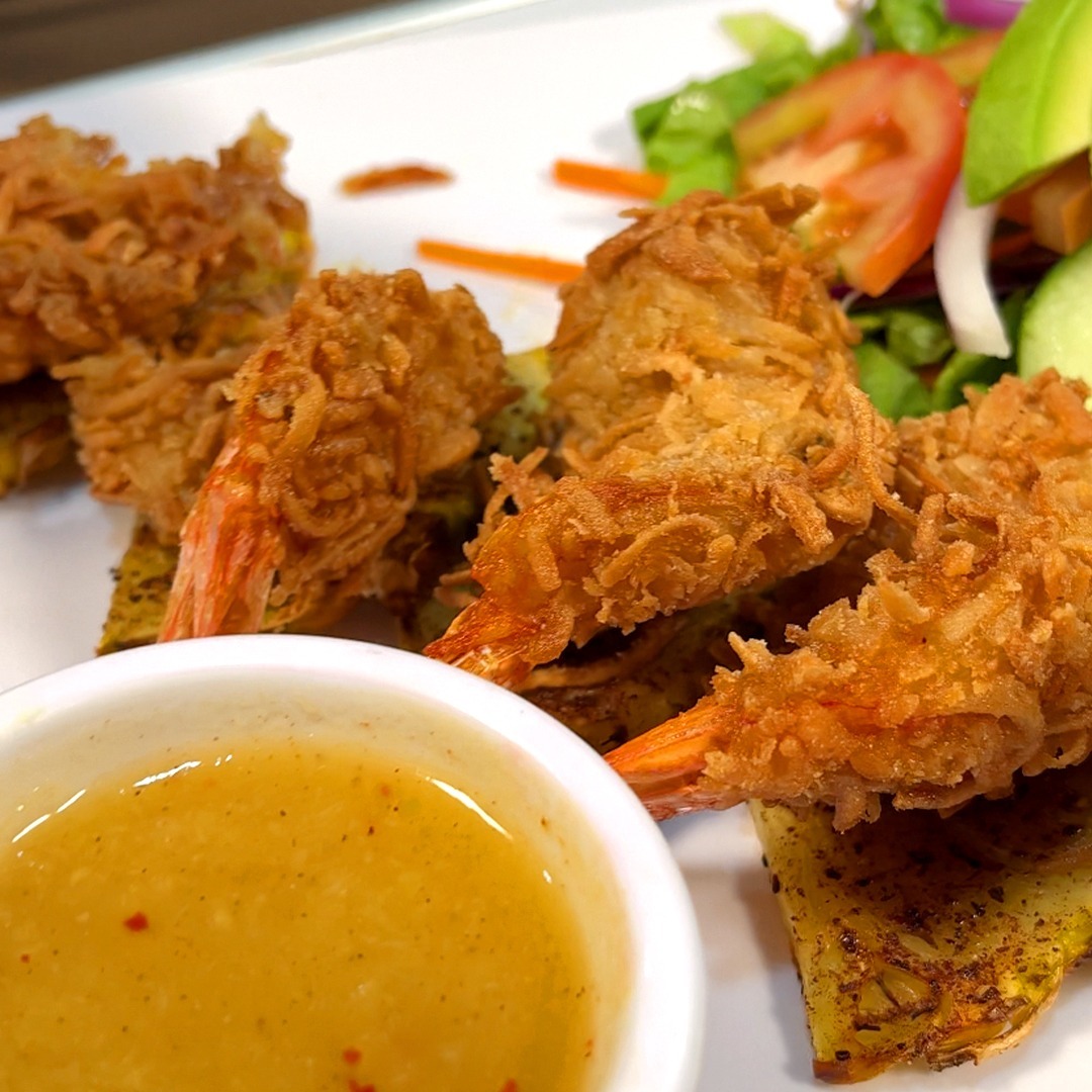 Camarones capeados con coco, acompañados de piña asada y caramelizada con salsa de piña picosita