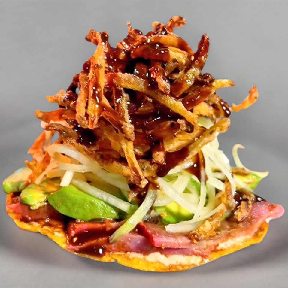 Tostada ajonjoli, aderezo de la casa, atun en laminas, salsa negras preparadas, cebolla frita aguacate y pepino