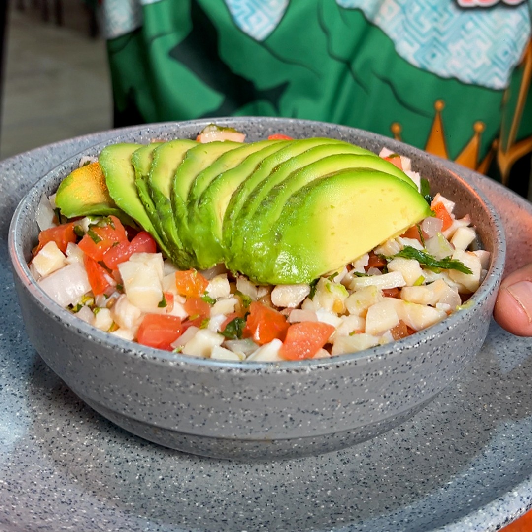 Camaron Coctelero, pulpo surimi, catusp preparada, aderoz de la casa, cebolla cilantro y aguacate