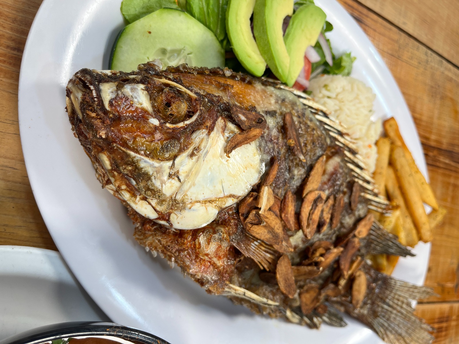 Mojarra frita bañada en salsa mojo, acompañada de arroz, papas fritas ensalada verde y consome personal