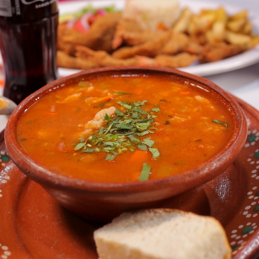 Caldo Camaron, acompañado de pieza de pan y arroz