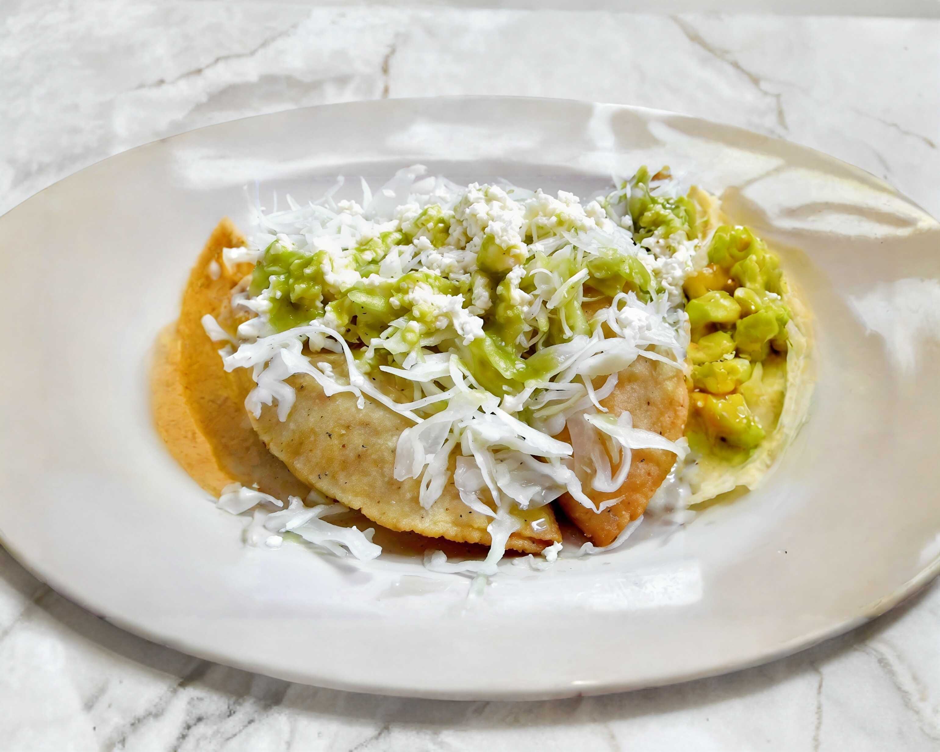 (4) tortilla de maíz rellena de picadillo y Oaxaca acompañada de repollo, crema y salsa