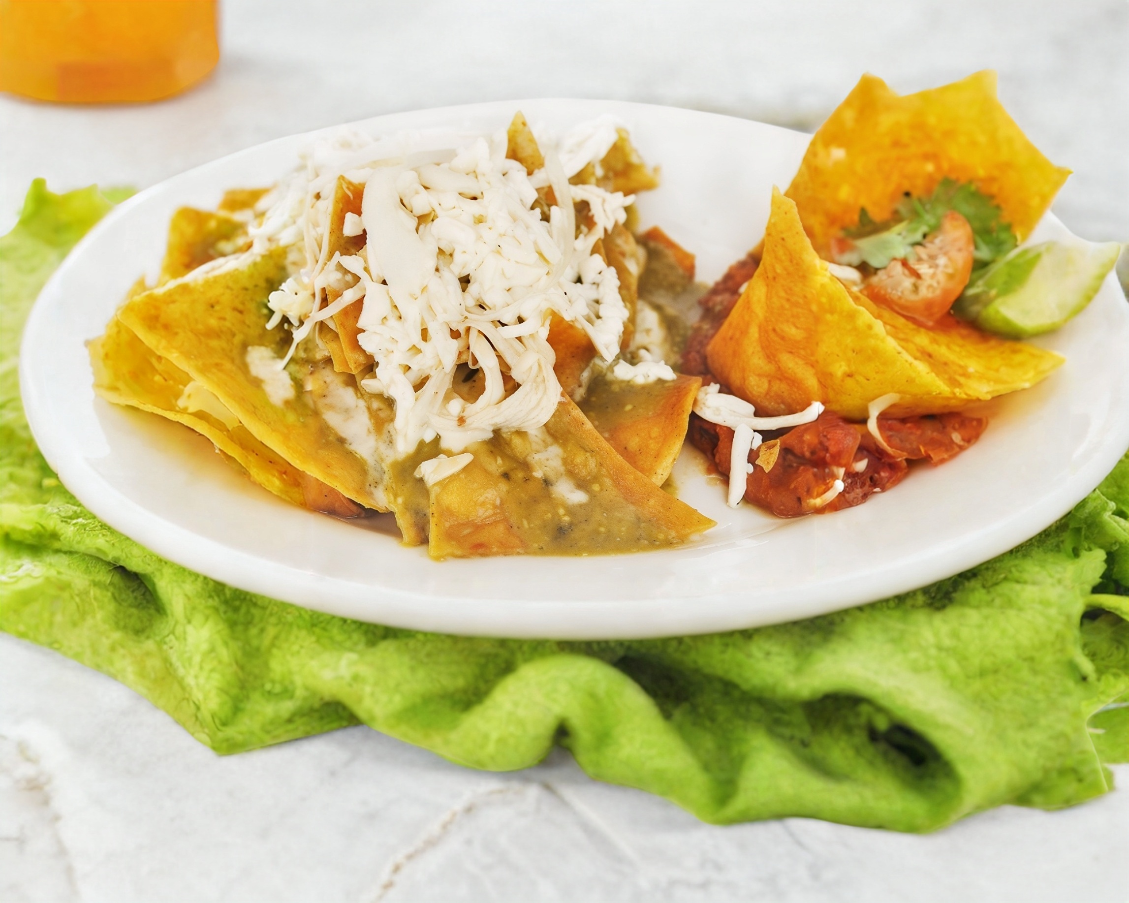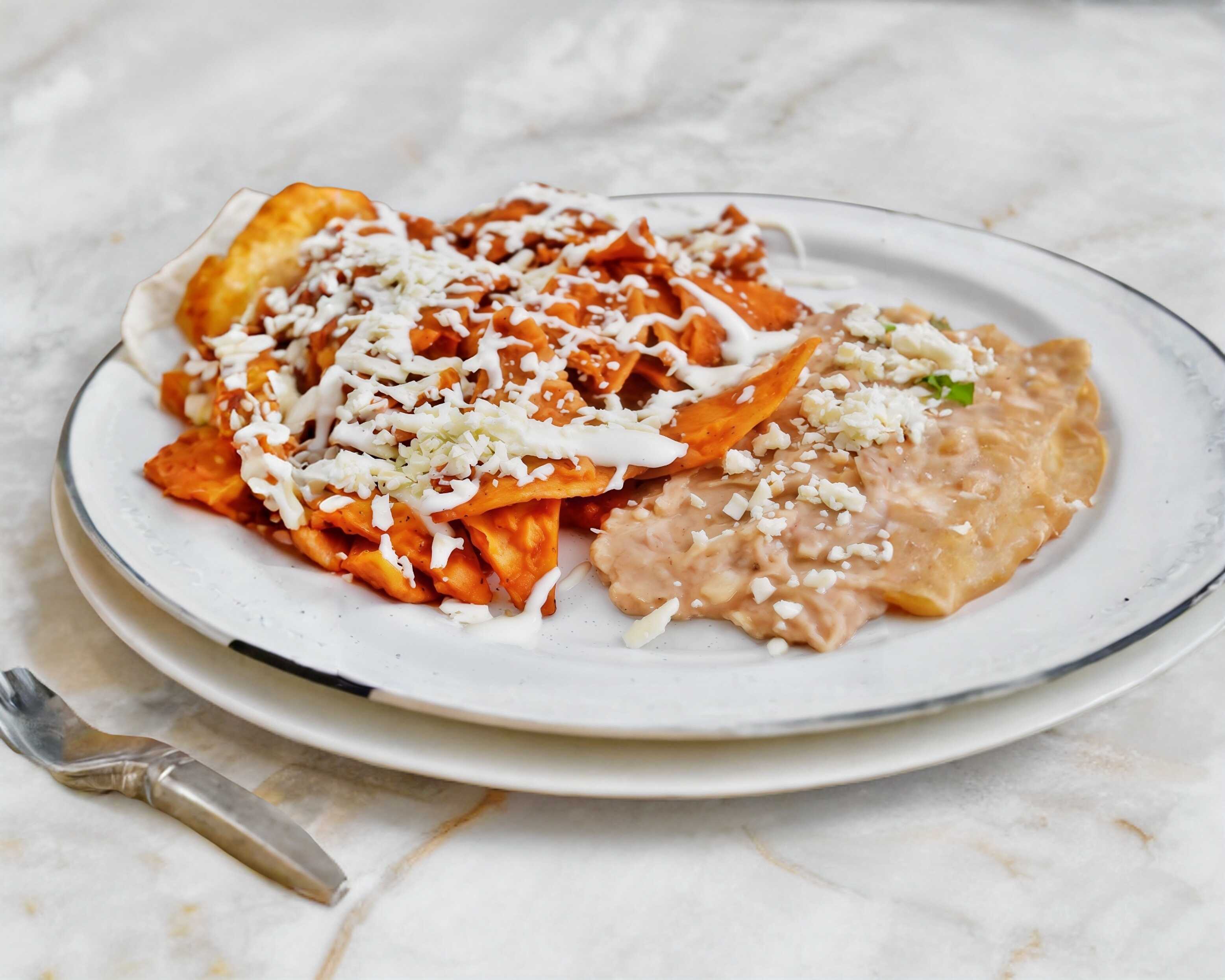 Tortillas de maíz frita bañadas con una rica salsa verde, queso ranchero, acompañada de crema y frijoles