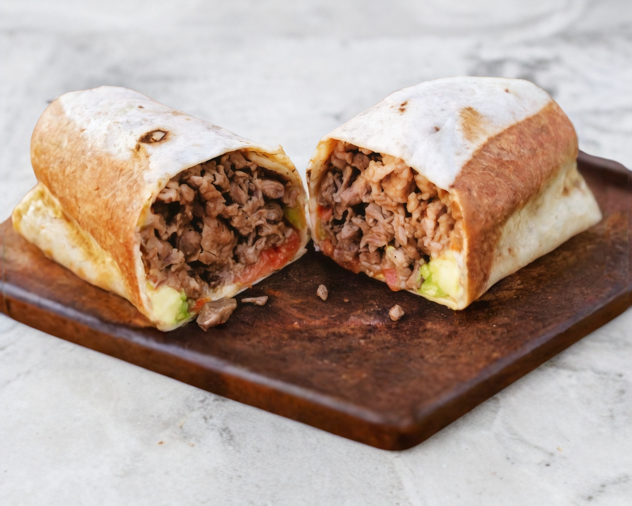 Tortilla de harina,carne asada,frijoles,lechuga,aguacate y complementos .
