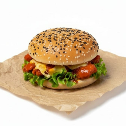 hamburguesa de boneless, queso americano, lechuga, tomate, y aderezo de la casa
