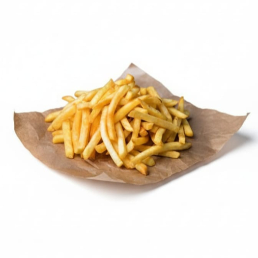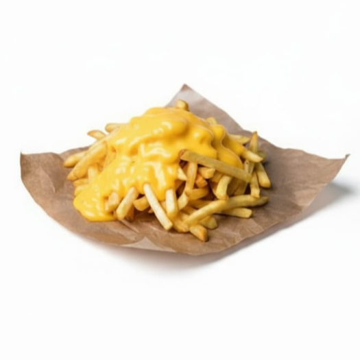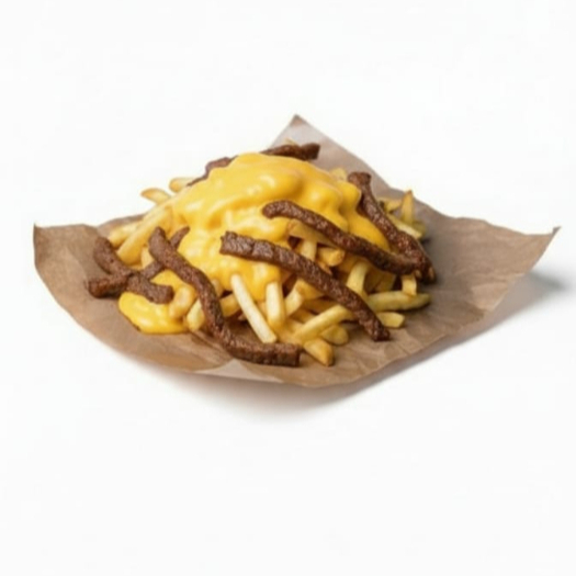 Cama de papas a la francesa, queso amarillo, carne de hamburguesa y queso manchego