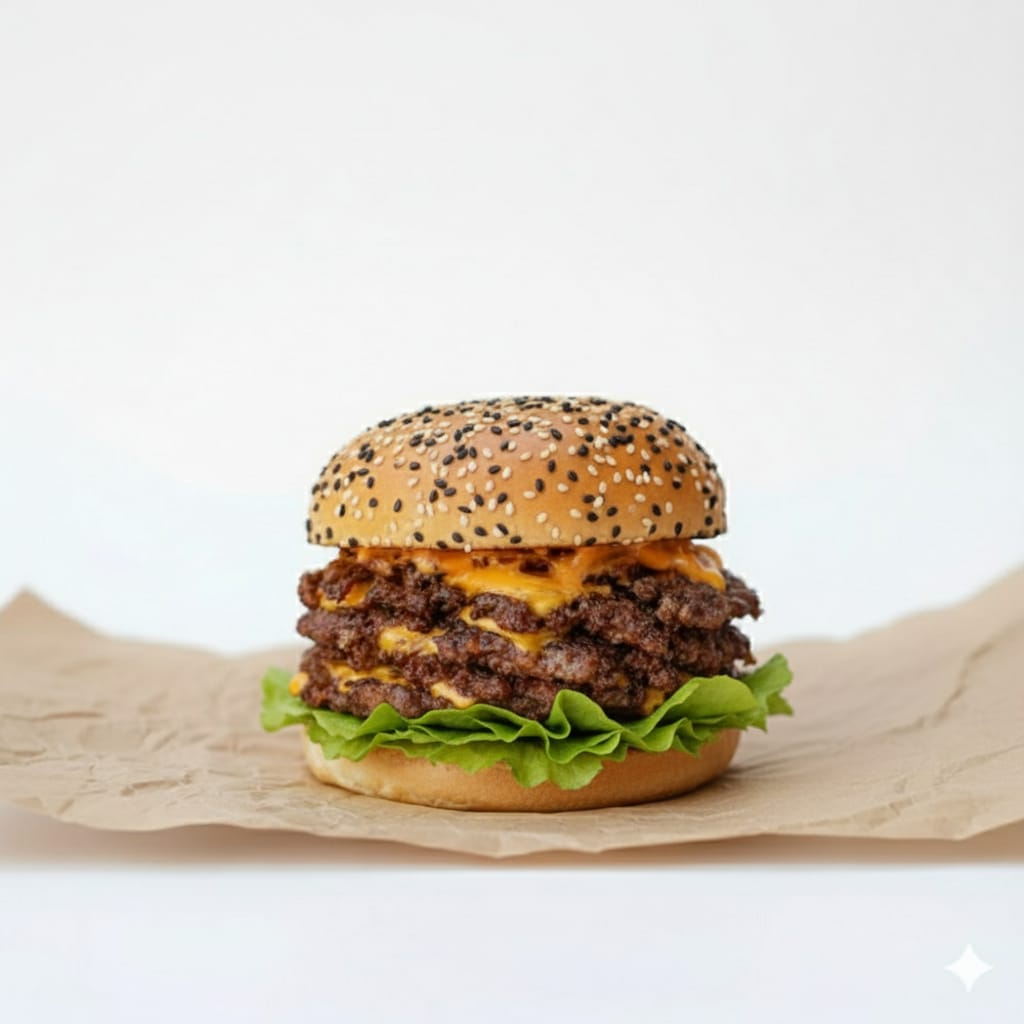 hamburguesa cuádruple americana tipo smash, queso americano, lechuga, tomate, y aderezo de la casa