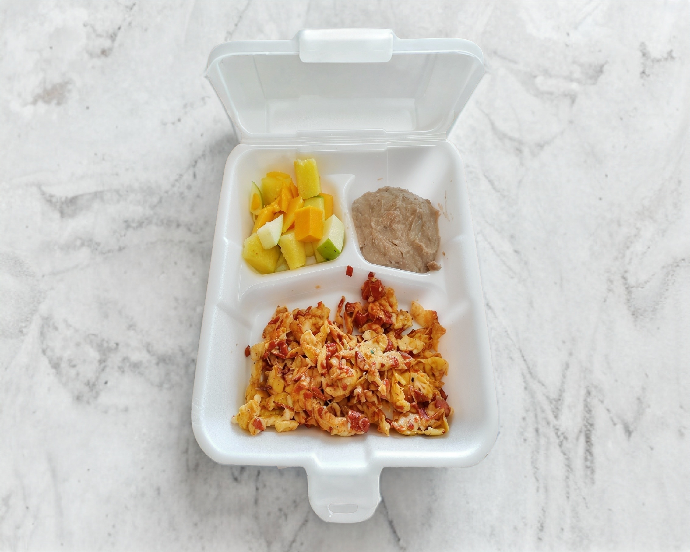 Delicioso desayuno Tradicional, incluye 2 huevos revueltos con chorizo o jamón, 1 porción de coctel de frutas del dia y frijoles refritos.