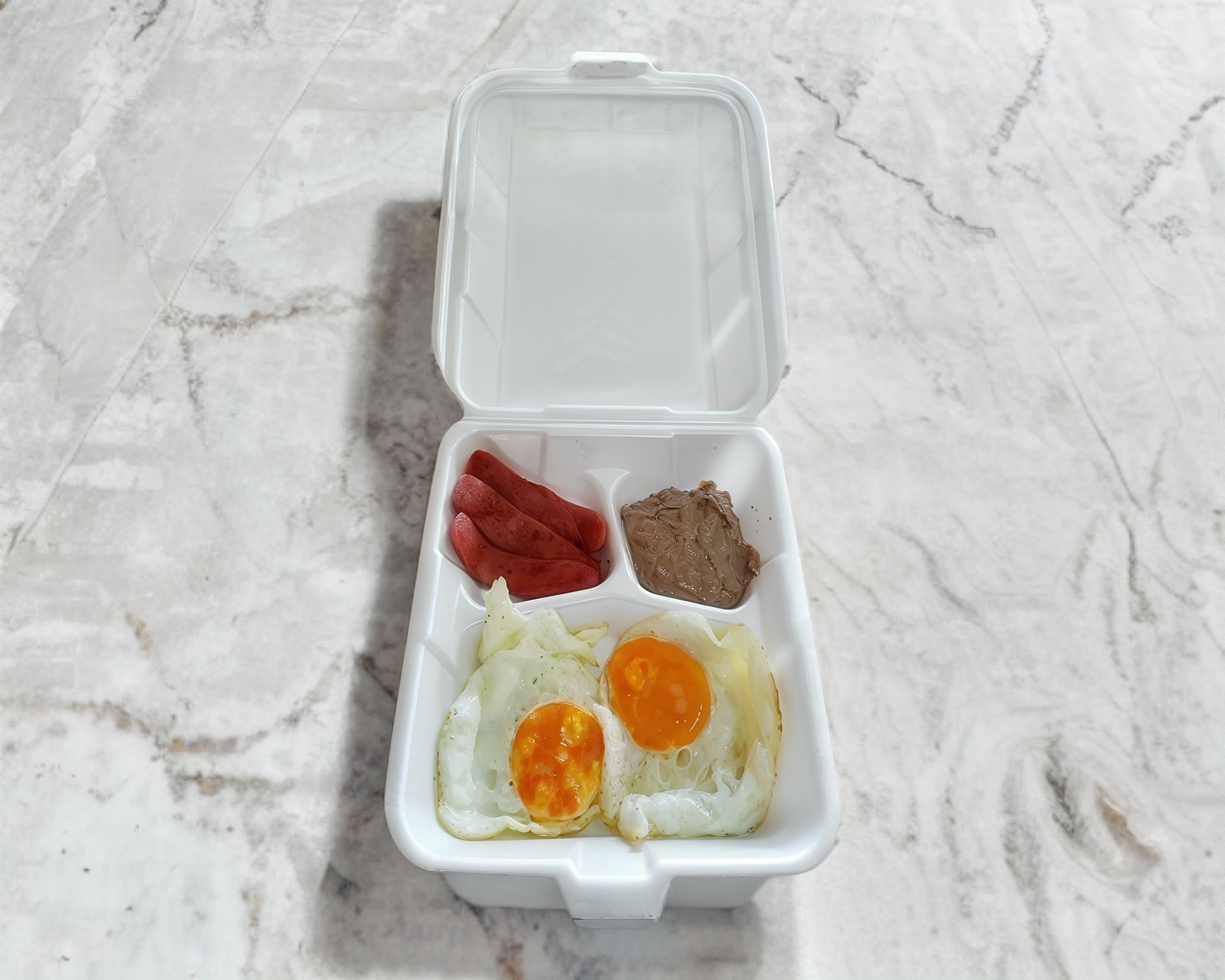 Delicioso Almuerzo casero, contiene 2 huevos estrellados sobre tortilla, acompañados con salchicha de pavo , frijoles refritos y Salsa verde casera.