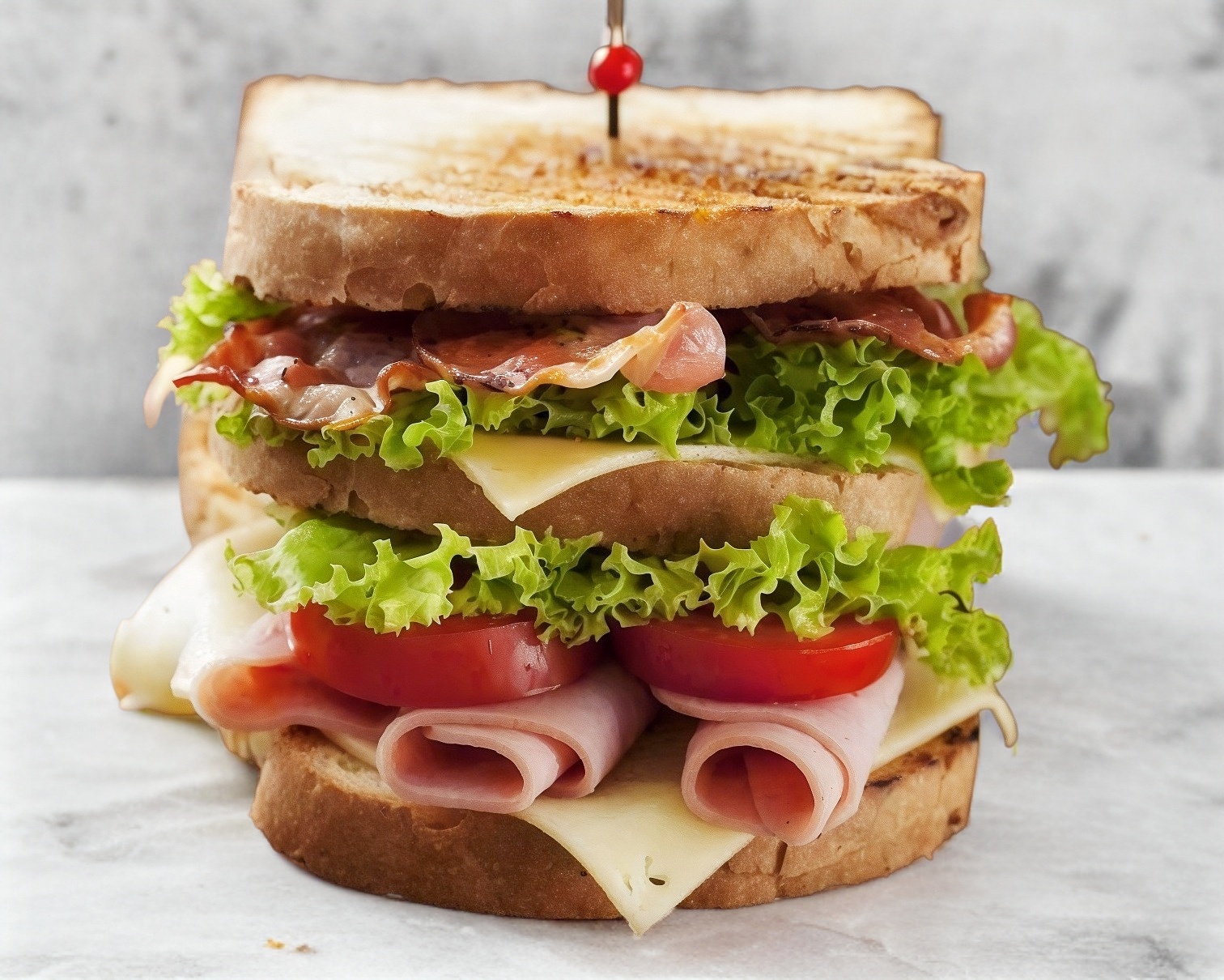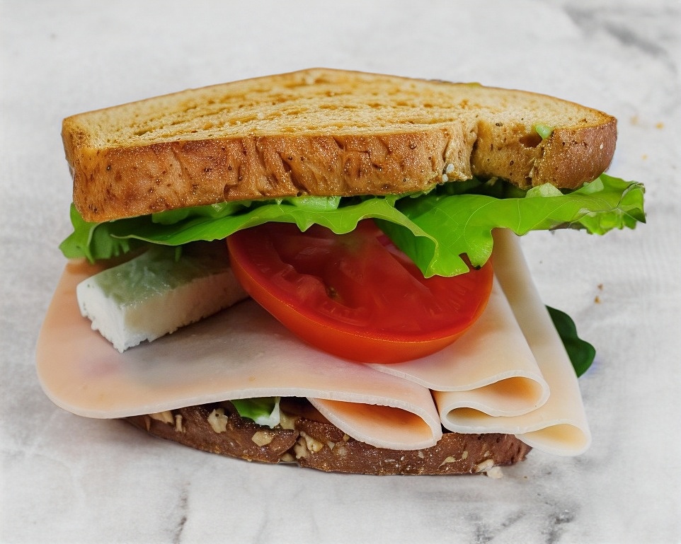 Sandwich con 3 rebanadas de pan multigrano a la plancha con aderezo de la casa, jamón de pavo y queso amarillo (1er. nivel), pollo a la peperlemon (2o. nivel) lechuga, tomate, aguacate y cebolla.