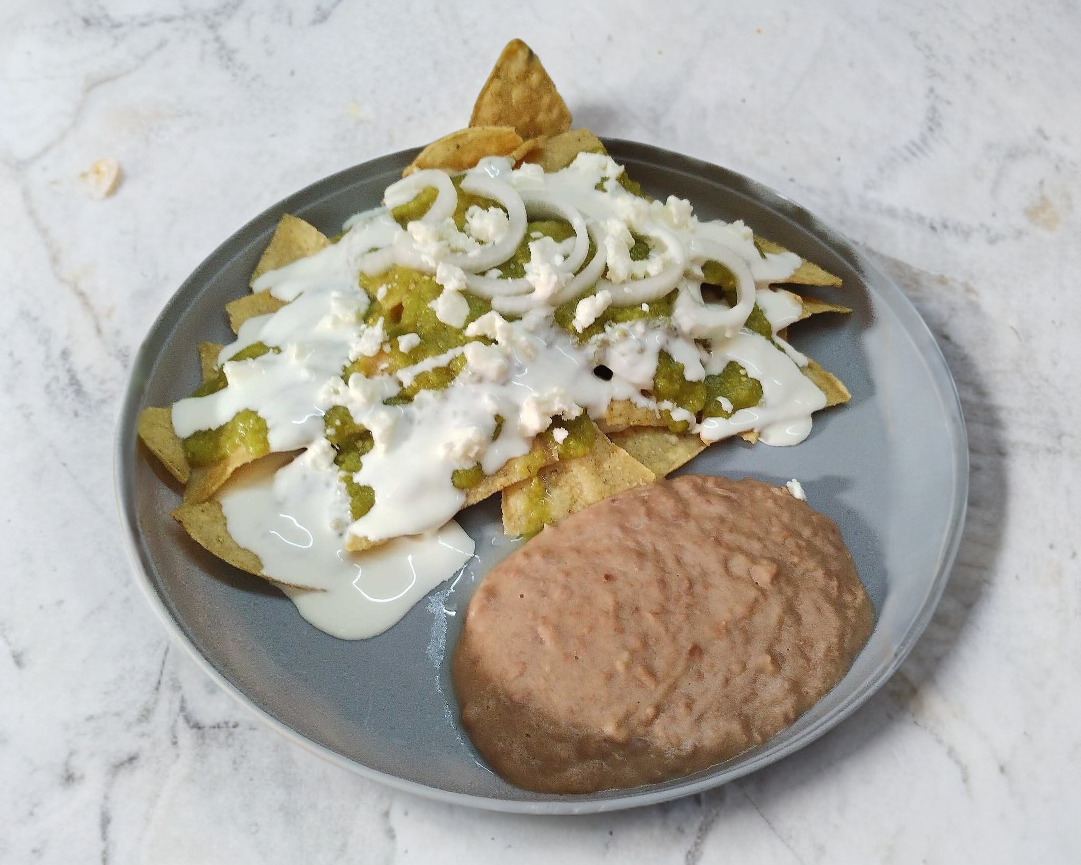 Deliciosos chilaquiles con salsa verde, acompañados con queso panela, crema, cebolla, proteína a elección y una bola de frijoles refritos.