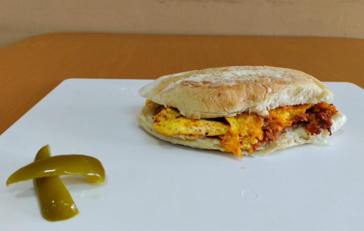 Torta caliente en pan artesanal de huevo con chorizo, mantequilla, una capa de frijoles refritos y tomate.(Porcion personal)
