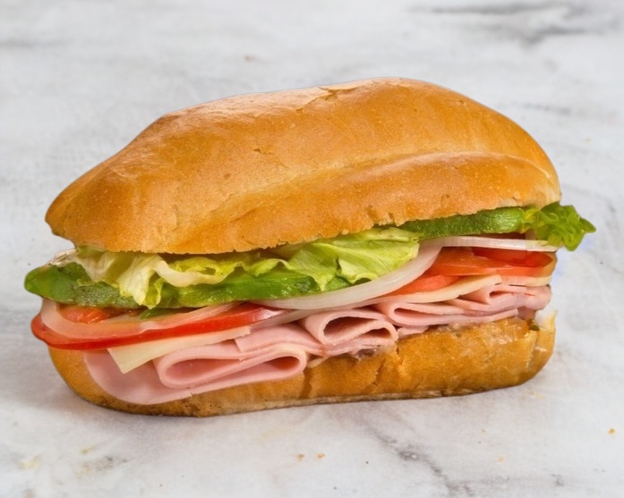 Torta en pan artesanal con 3 carnes frías, jamón de pavo, pastel pimiento y mortadela, aguacate, mayonesa, lechuga, tomate y cebolla.