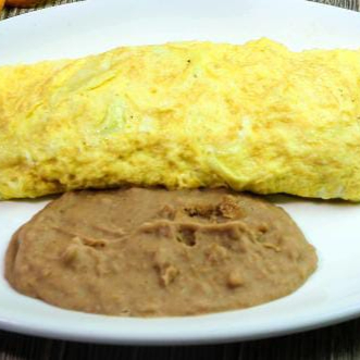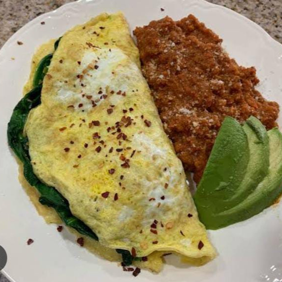 Huevos batidos con queso mozarella, espinacas, acompañado de frijoles fritos,picoDeGallo, tortillas de maiz