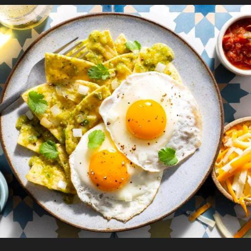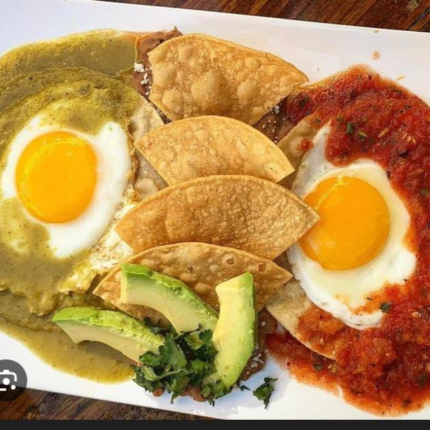 2 huevos estrellados acompañados de salsa roja y verde con totopos y aguacate incluye frijoles.