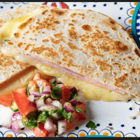 Doble tortilla de harina jamón de pavo y queso mozarella (incluye) aguacate y pico de gallo