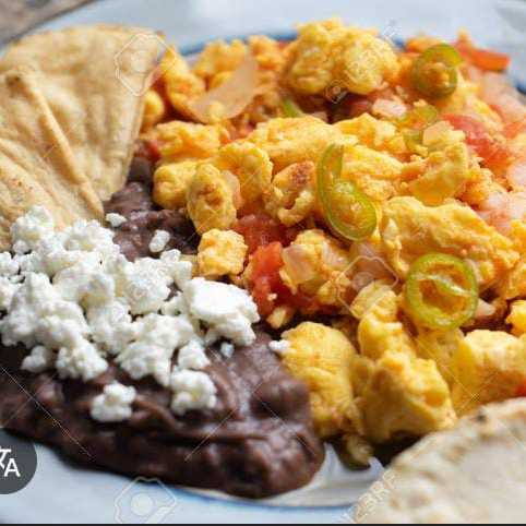 Huevos revueltos con chile, tomate, cebolla, acompañado de frijoles y totopos y salsa al gusto.
