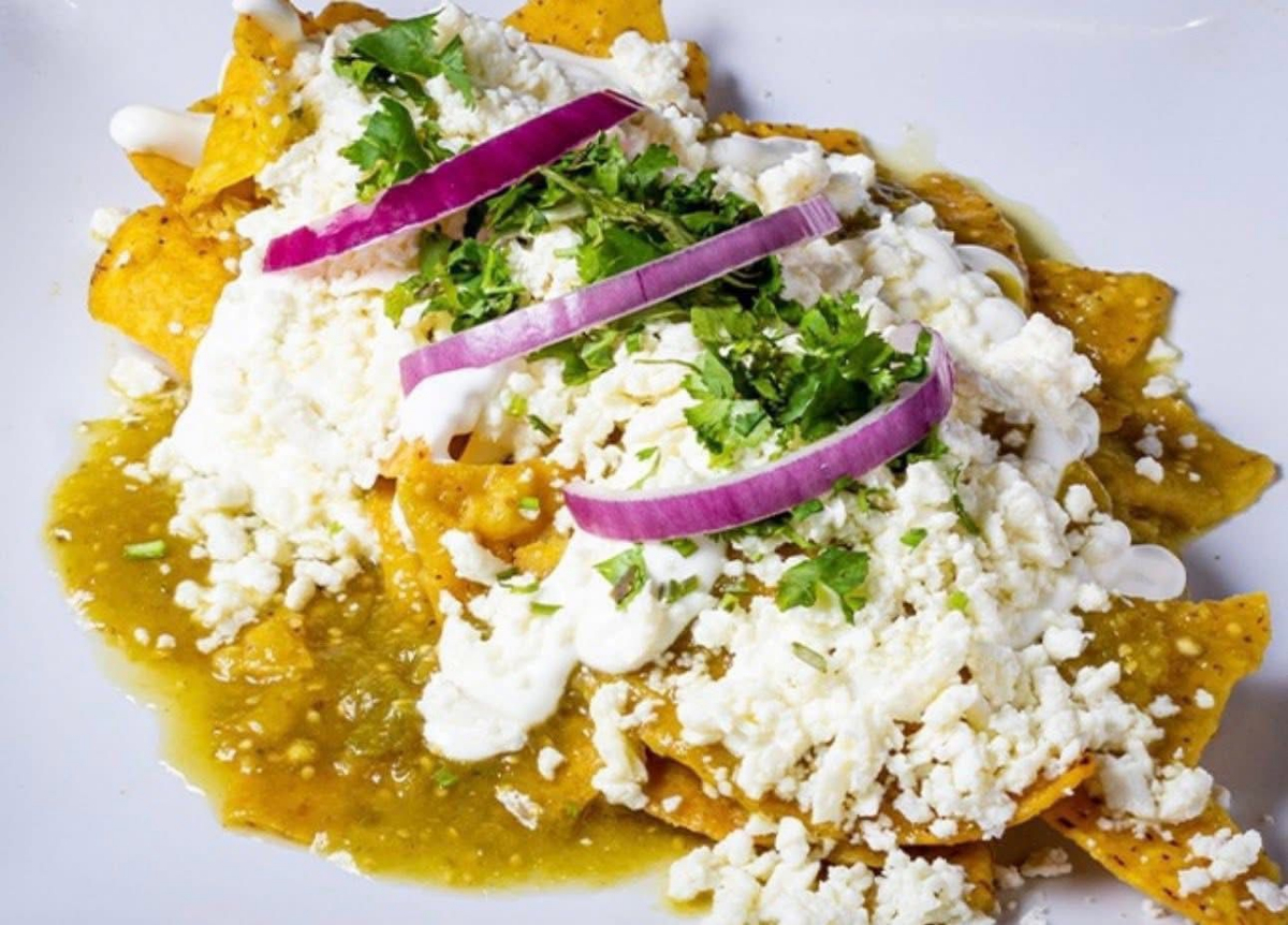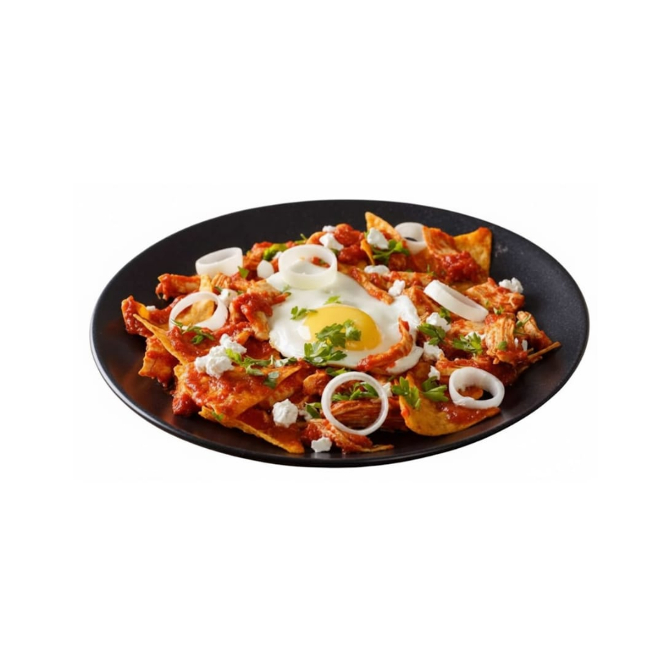 Totopos bañados en salsa, servidos con huevo al gusto y queso fresco.