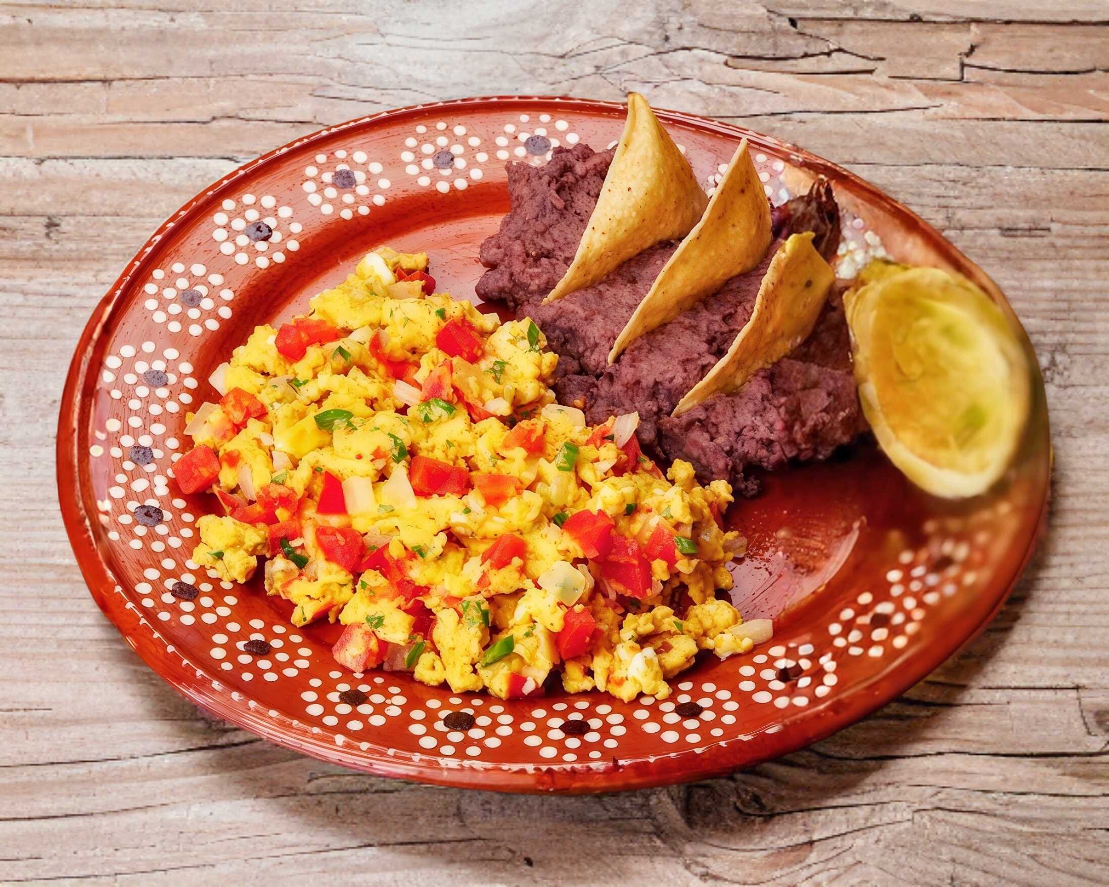 Huevos a la mexicana, acompañado de frijoles negros refritos tortillas y salsa