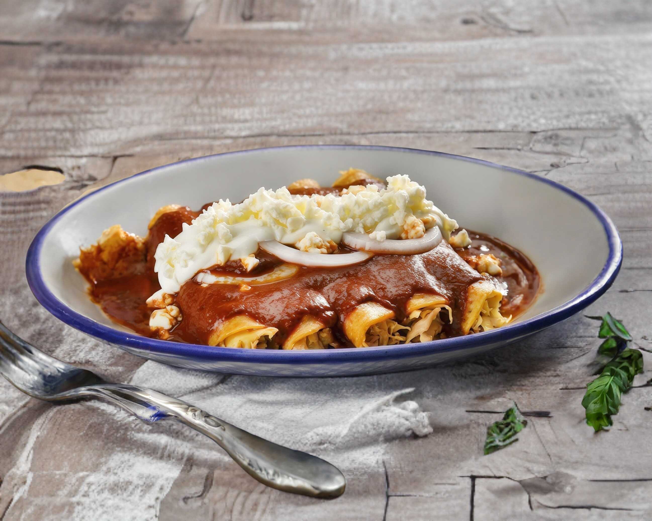 5 pzs. de Tortillas de maiz rellenas de pollo, bañadas en mole 100% oaxaqueño , complementado con cebollas blancas cortadas en julianas y espolvoreado de queso fresco.