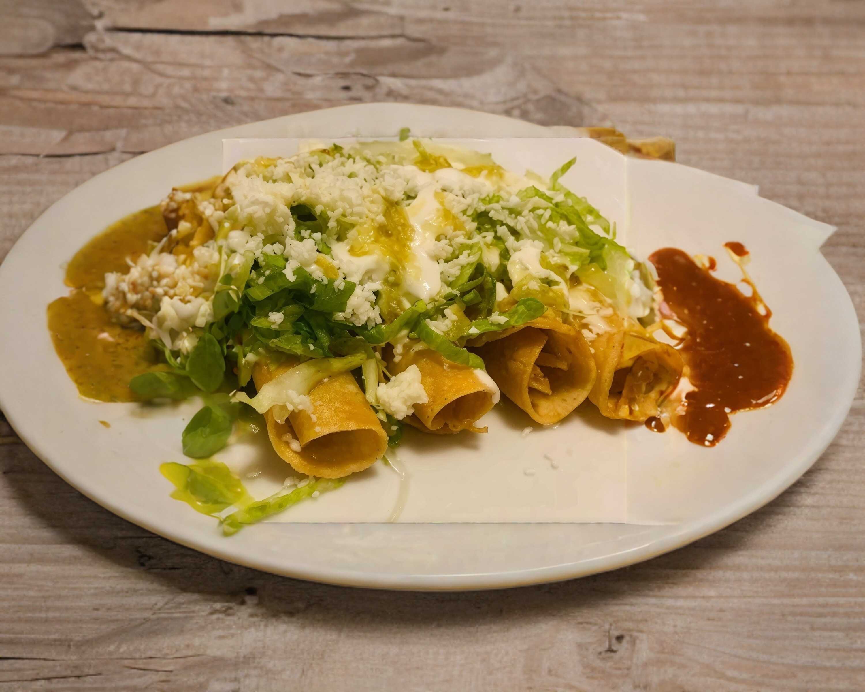 6 Tortillas de maiz en forma de tacos rellenas de pollo, fritas en aceite. Acompañado de lechuga, crema y salsa