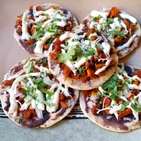 5 piezas de tortilla de maiz frita embarrada de pasta de frijol refrito, complementado con una capa de pollo desmenuzado, lechuga romana fresca, salsa crema